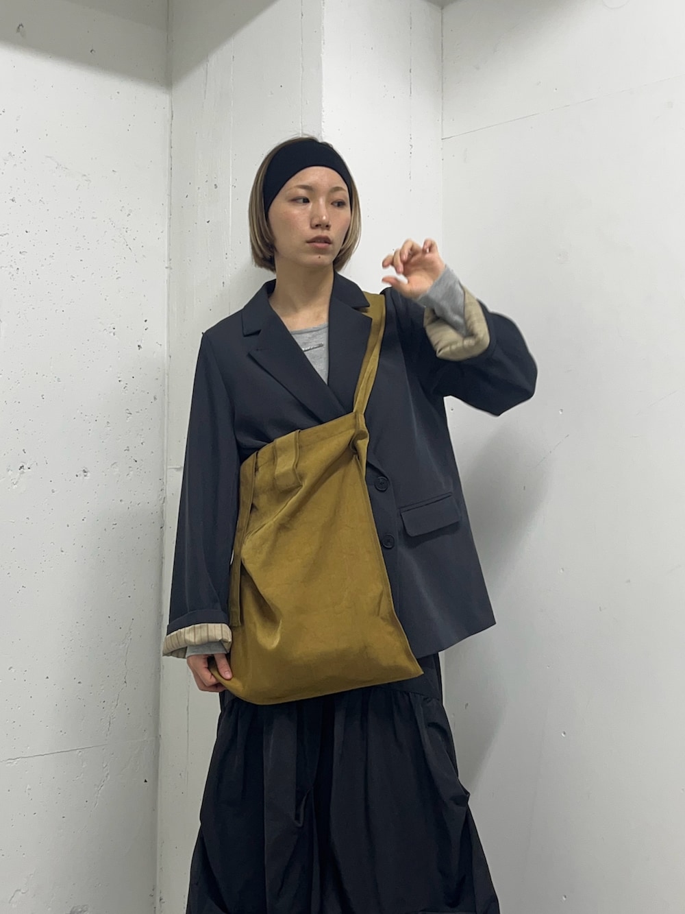 バッグを主役にするために、他のアイテムはダークトーンをチョイスしました。