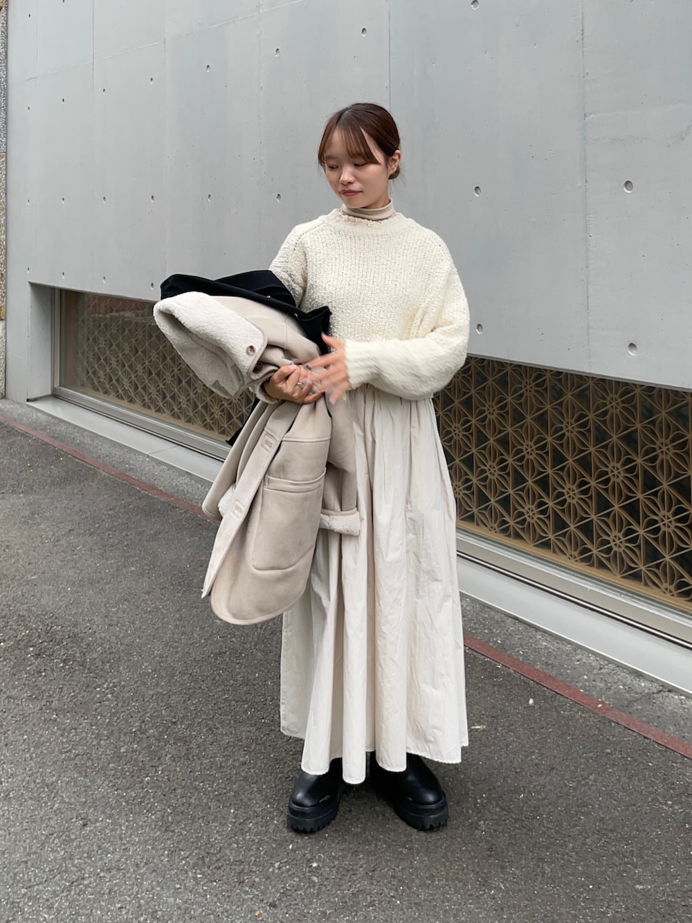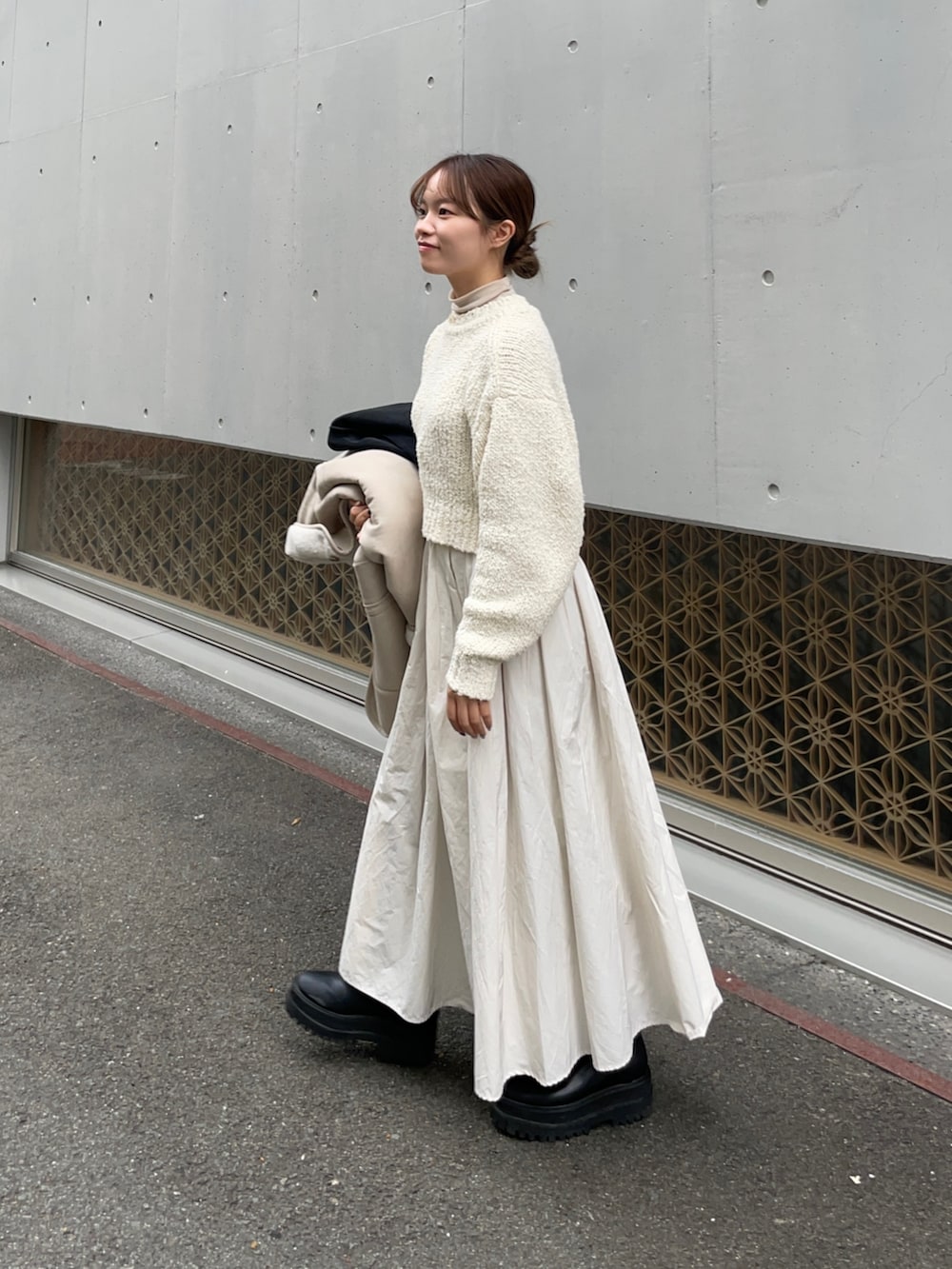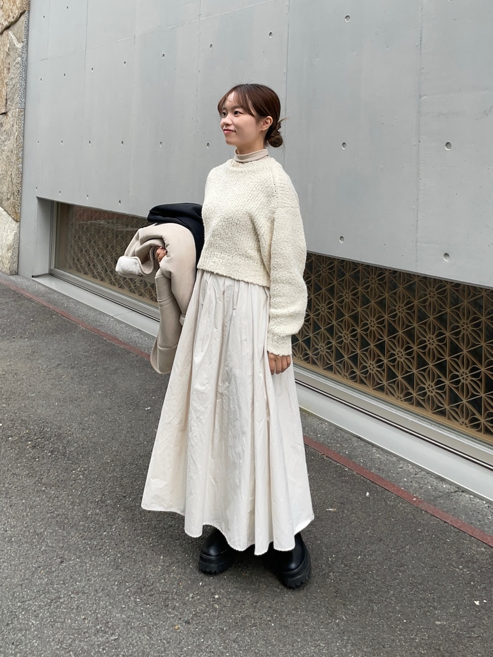 中のニットとスカートはリアルバイしたアイテムです!ニットは短丈で、写真のようなボリューム感のあるスカートやワイドパンツにもオススメな、お家で手洗い可能なニットです!