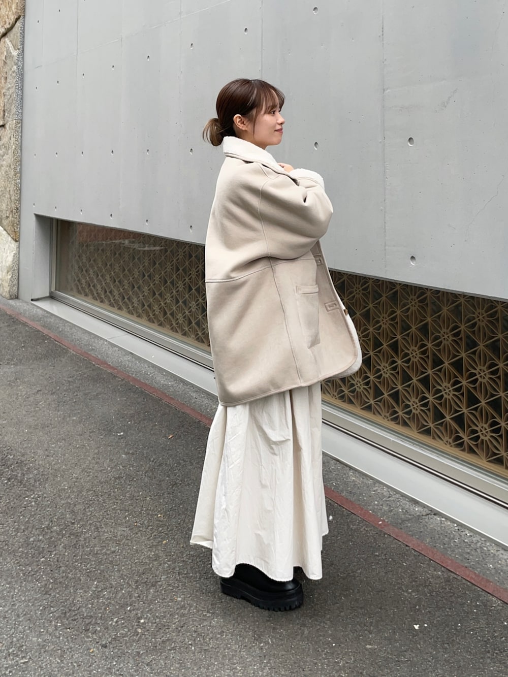 羽織はフェイクのムートンコートです!フランスのエコファーブランドECOPELに別注した特別なアイテムです!こちらはリバーシブルで2通りの着方が楽しめる2WAY仕様です✨フェイクだけど軽い着心地で、袖口も折ることで中のファーを見せることができ、可愛らしい印象になります!