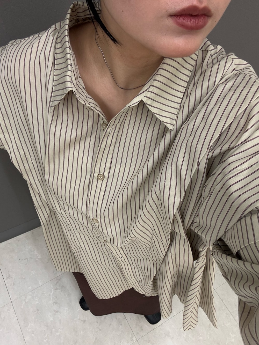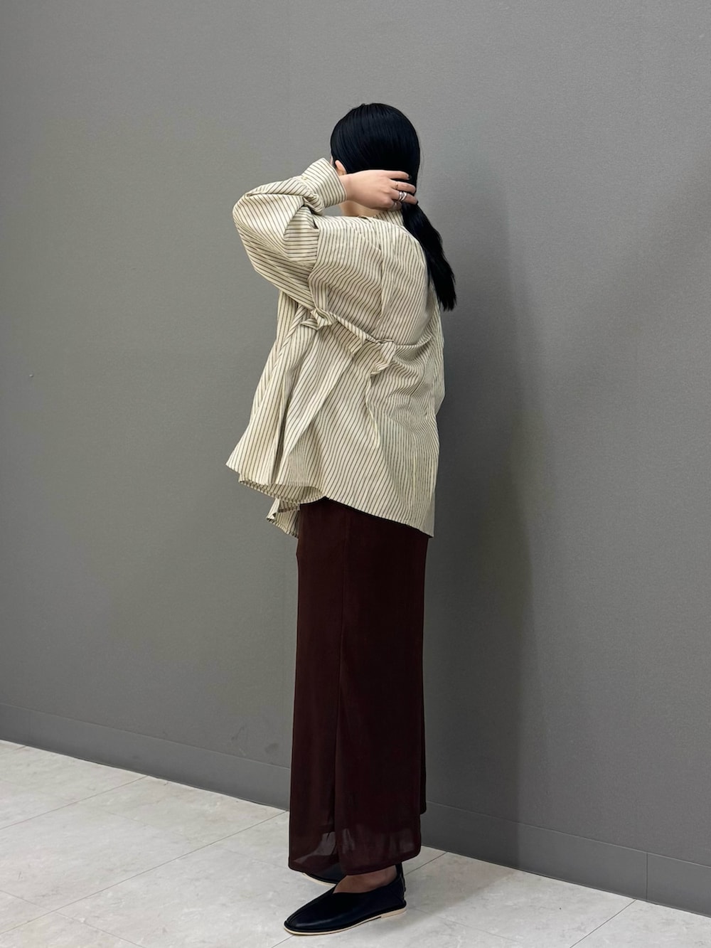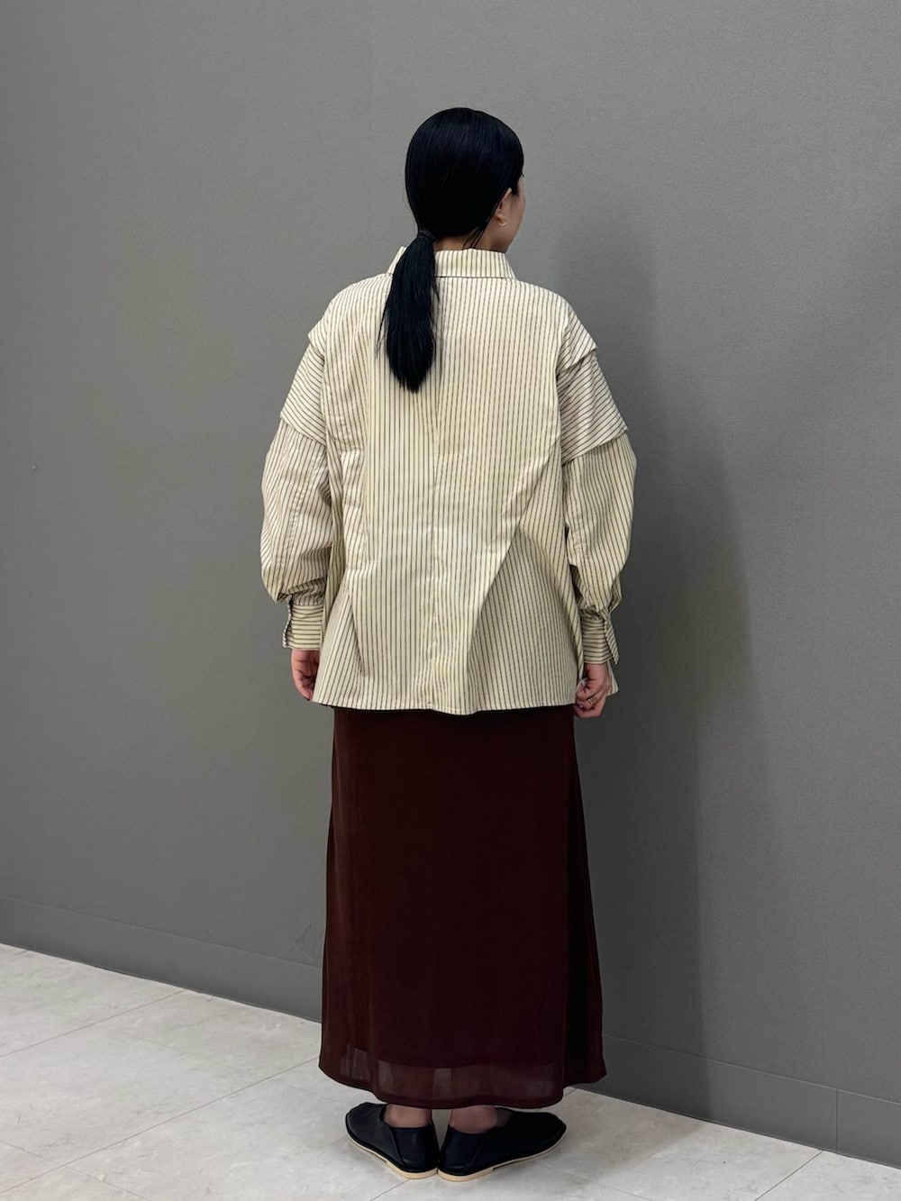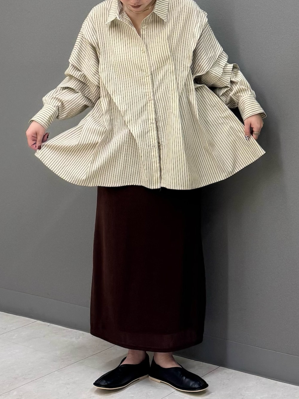 アシンメトリーに施されたタックが特徴的なストライプシャツ