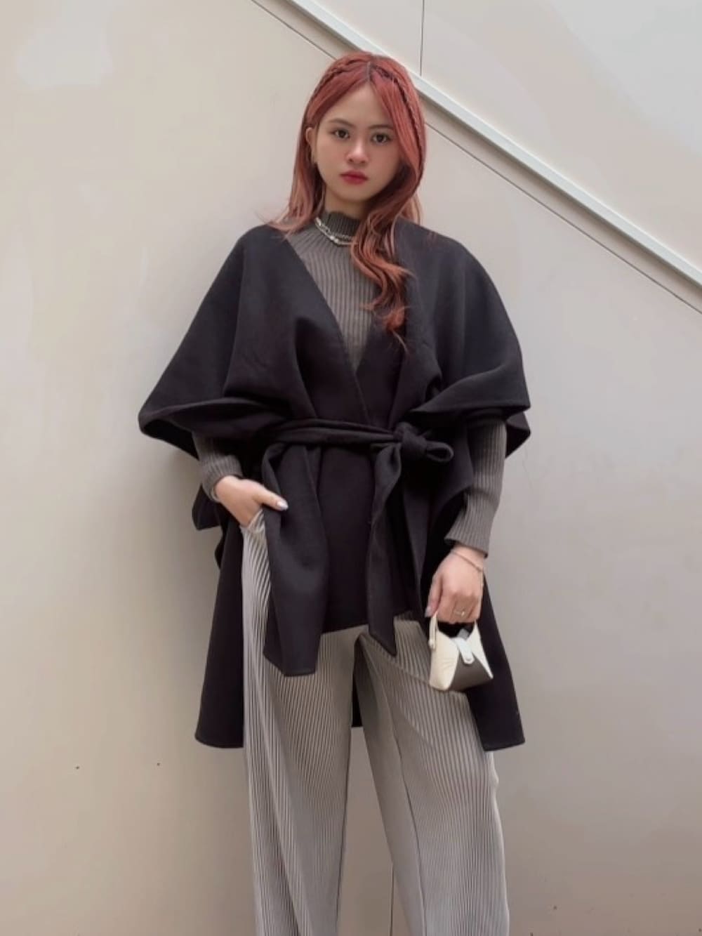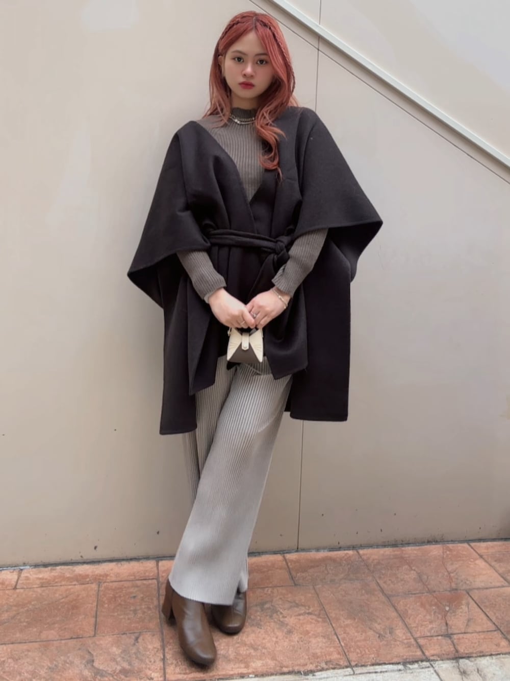 上からポンチョを重ねることで、体のラインをやさしく包み込みつつ、こなれ感をプラス。