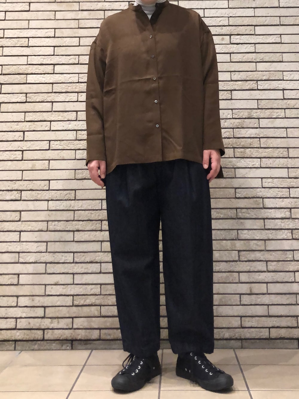 コンパクトな首元は上品な大人カジュアルに。そのまま1枚でももちろん、ベストやカーディガンを重ねて様々なスタイリングも◎