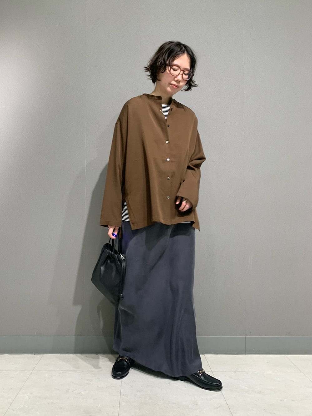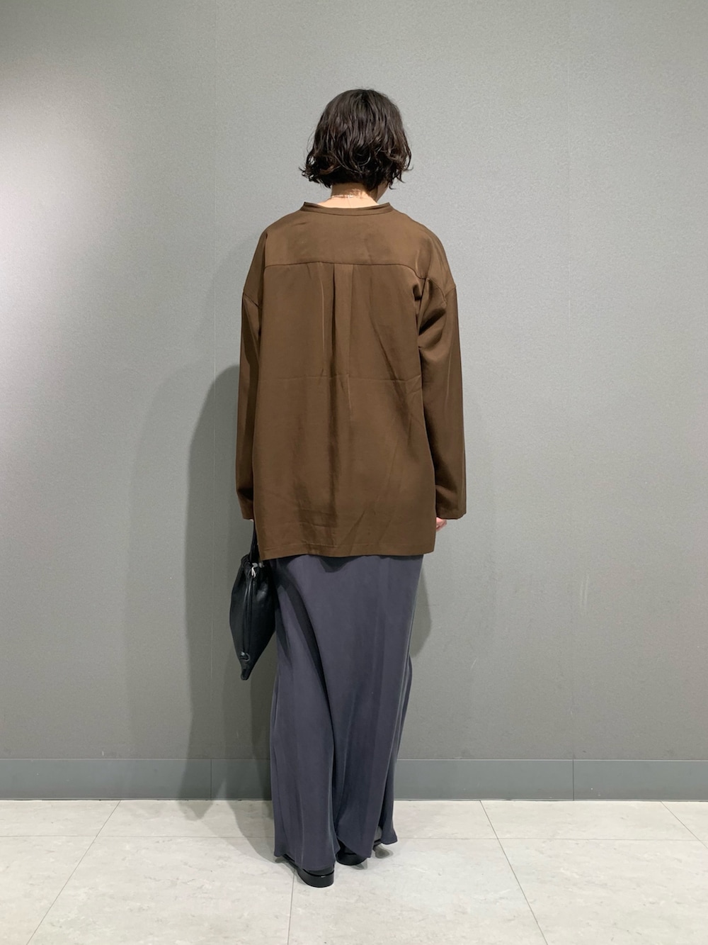 光沢のある綺麗めな素材のシャツです。広がりは抑えめで落ち感があります。ゆったりとしているので一枚でも羽織でも使えますし、ベストやジャケットのインナーとしても◎