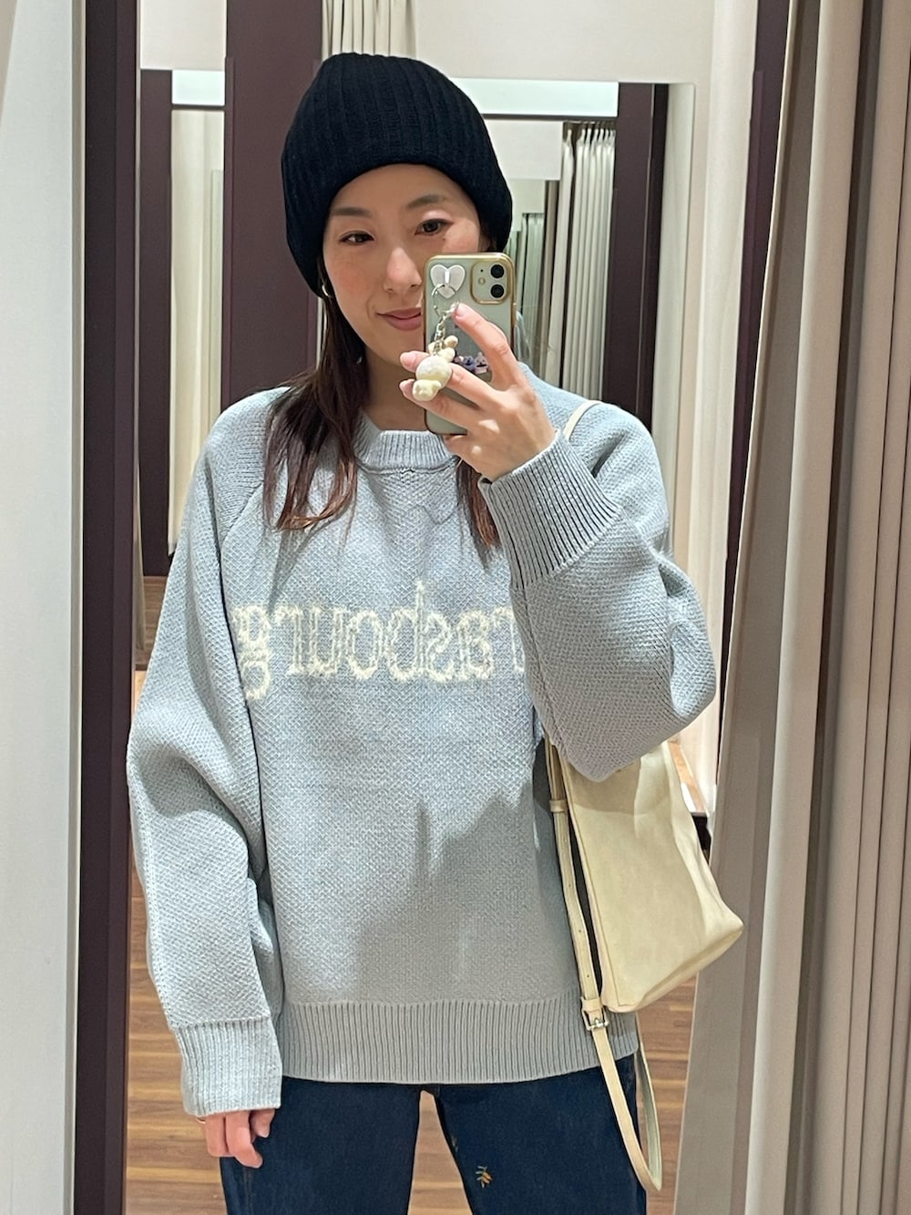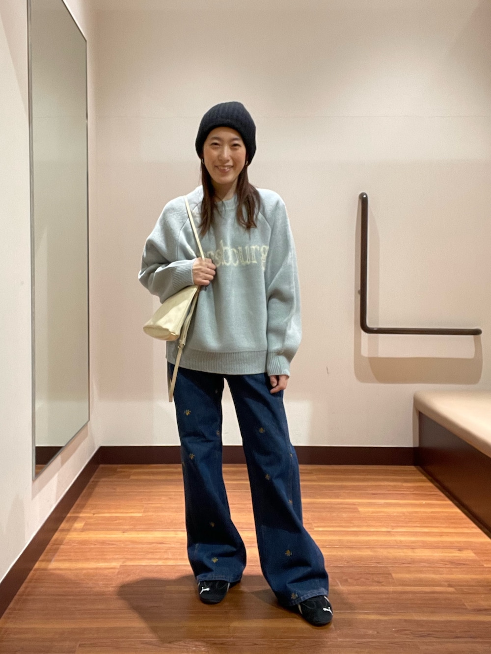トップスのロゴニットはゆったりとしたロング丈で腰回りをカバーできるのでオススメです❗️