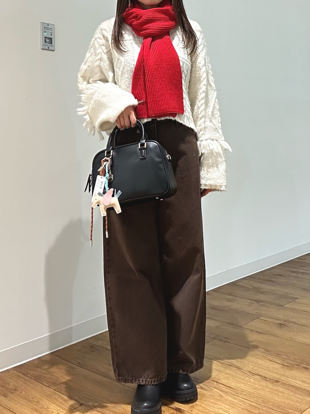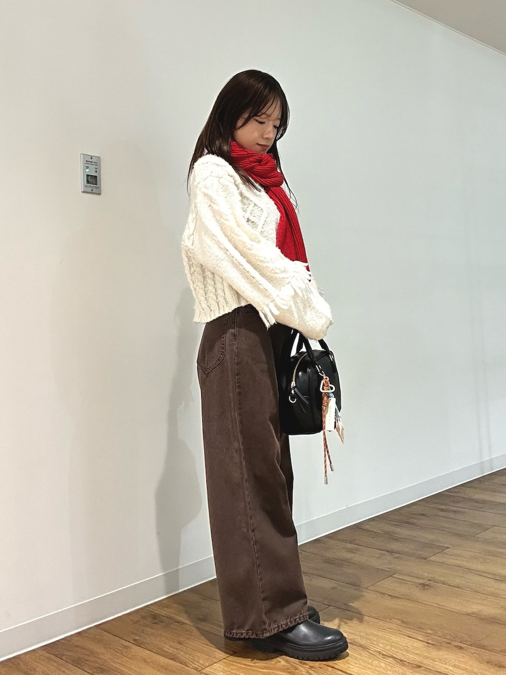 赤マフラーとブラウンデニムも相性抜群で可愛い🤎❤️