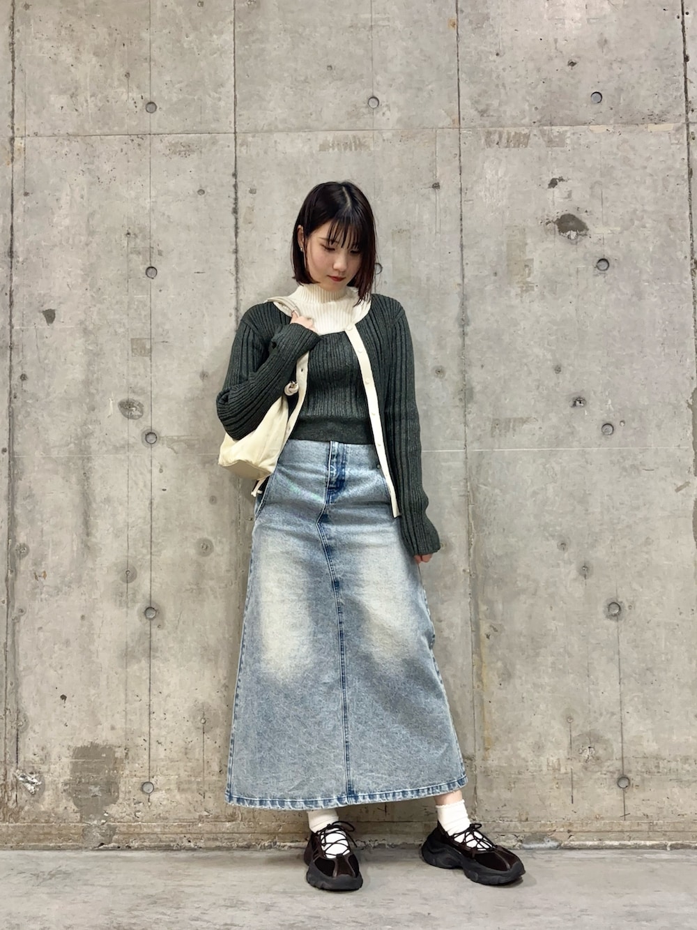 インナーに定番のリブハイネックセーターを合わせたら、今の時期からも着ることができるので、おすすめです✨