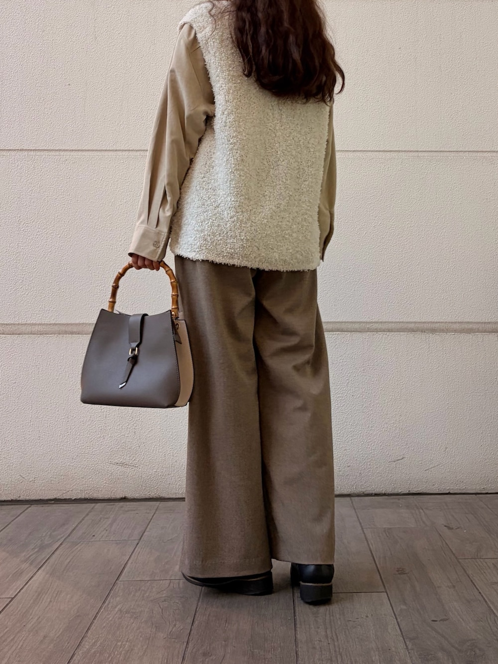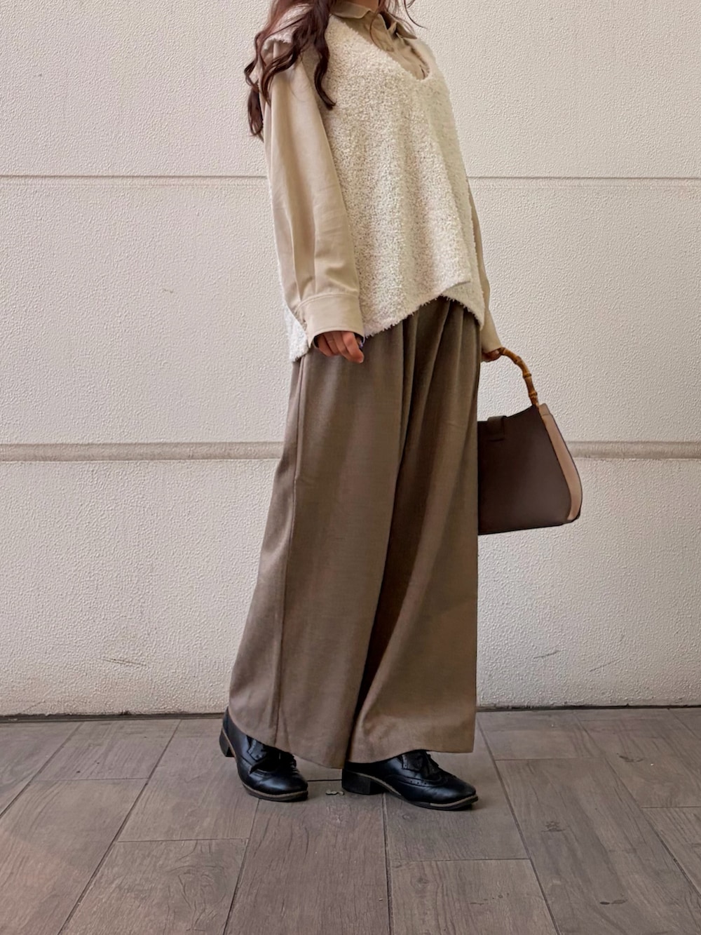 淡いベージュトーンでまとめた、春を感じさせるレイヤードコーデです🎶