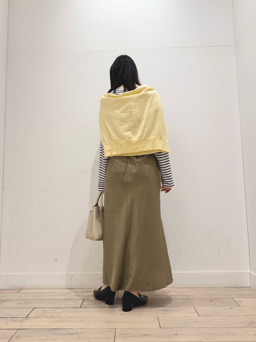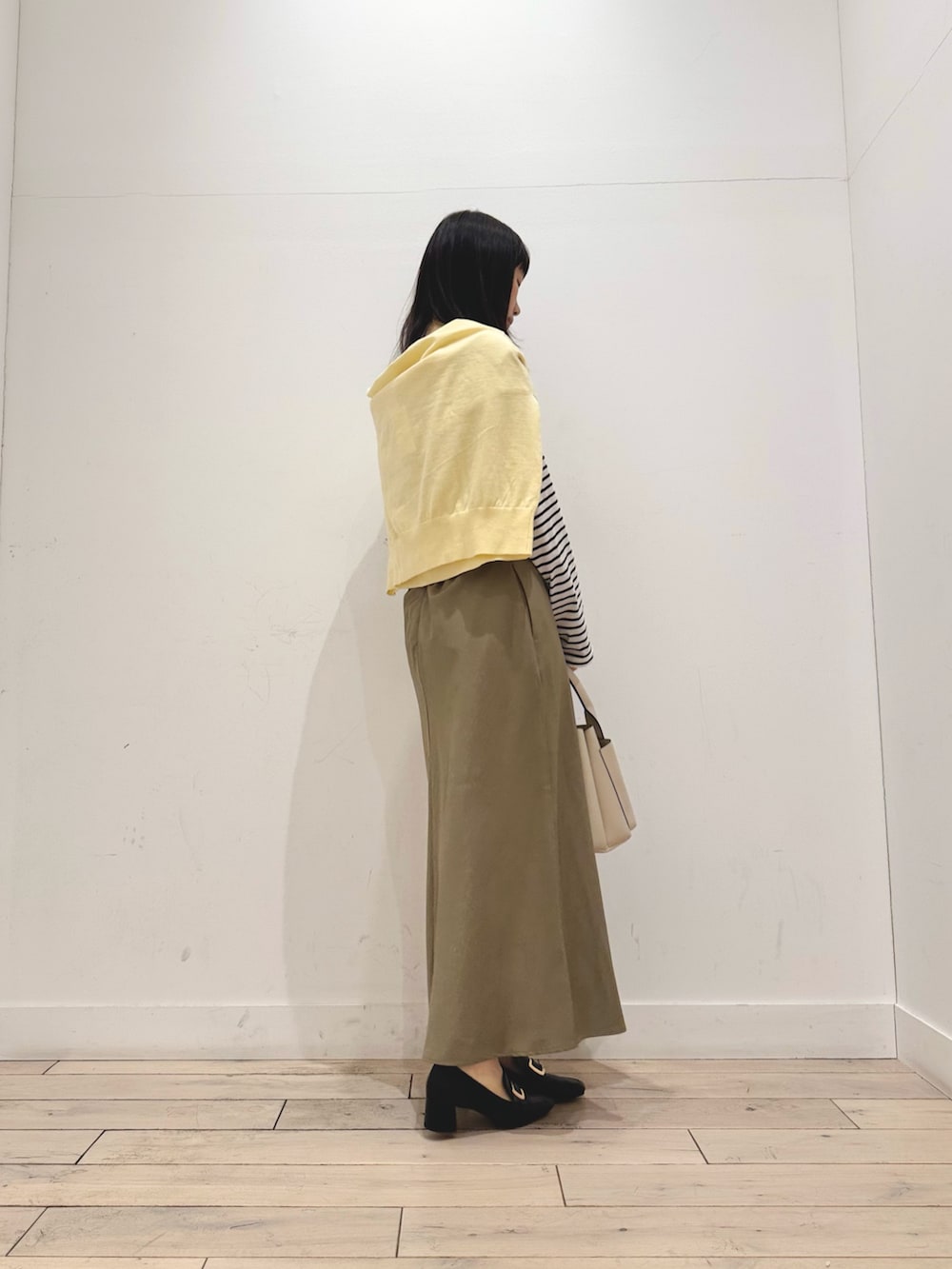 安心のボーダートップス×ベージュボトムにイエローのヘンリーネックを差し色に肩掛けしました🌻