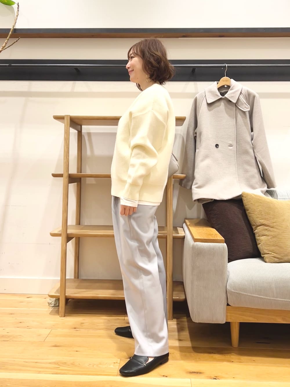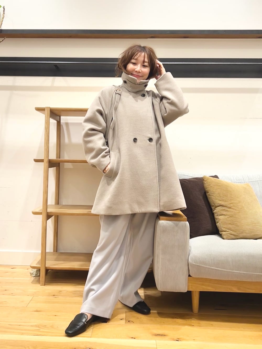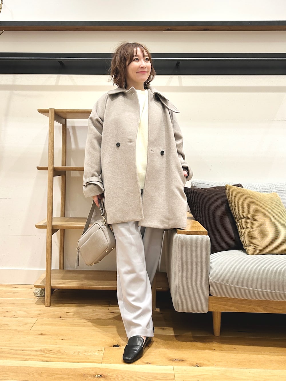 淡いカラーが冬のコーデを重たく見せず、デイリーに取り入れやすい一枚です。