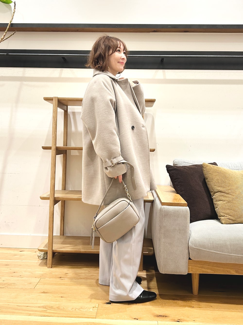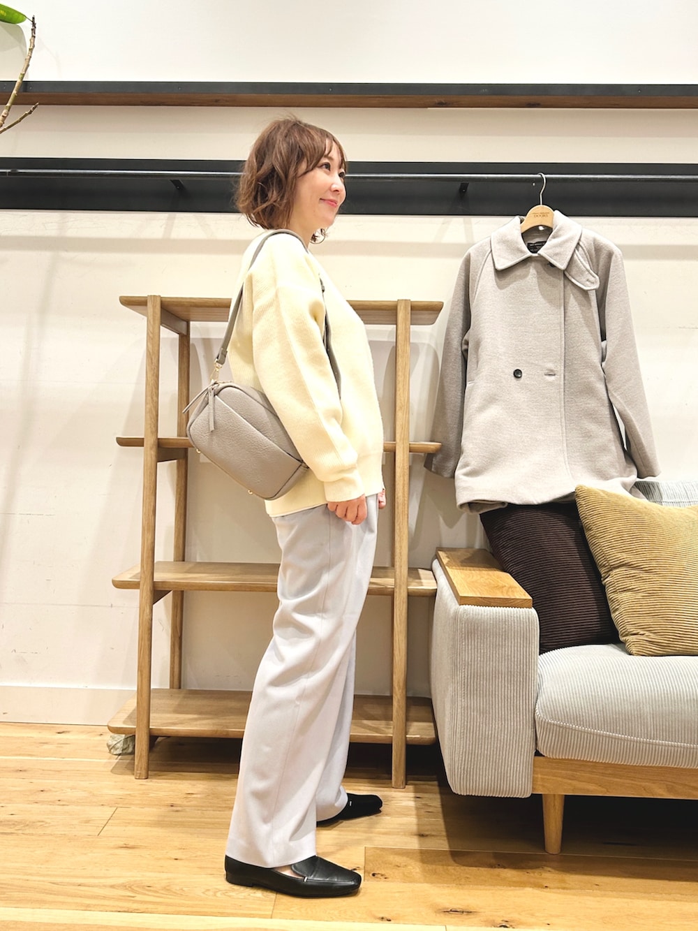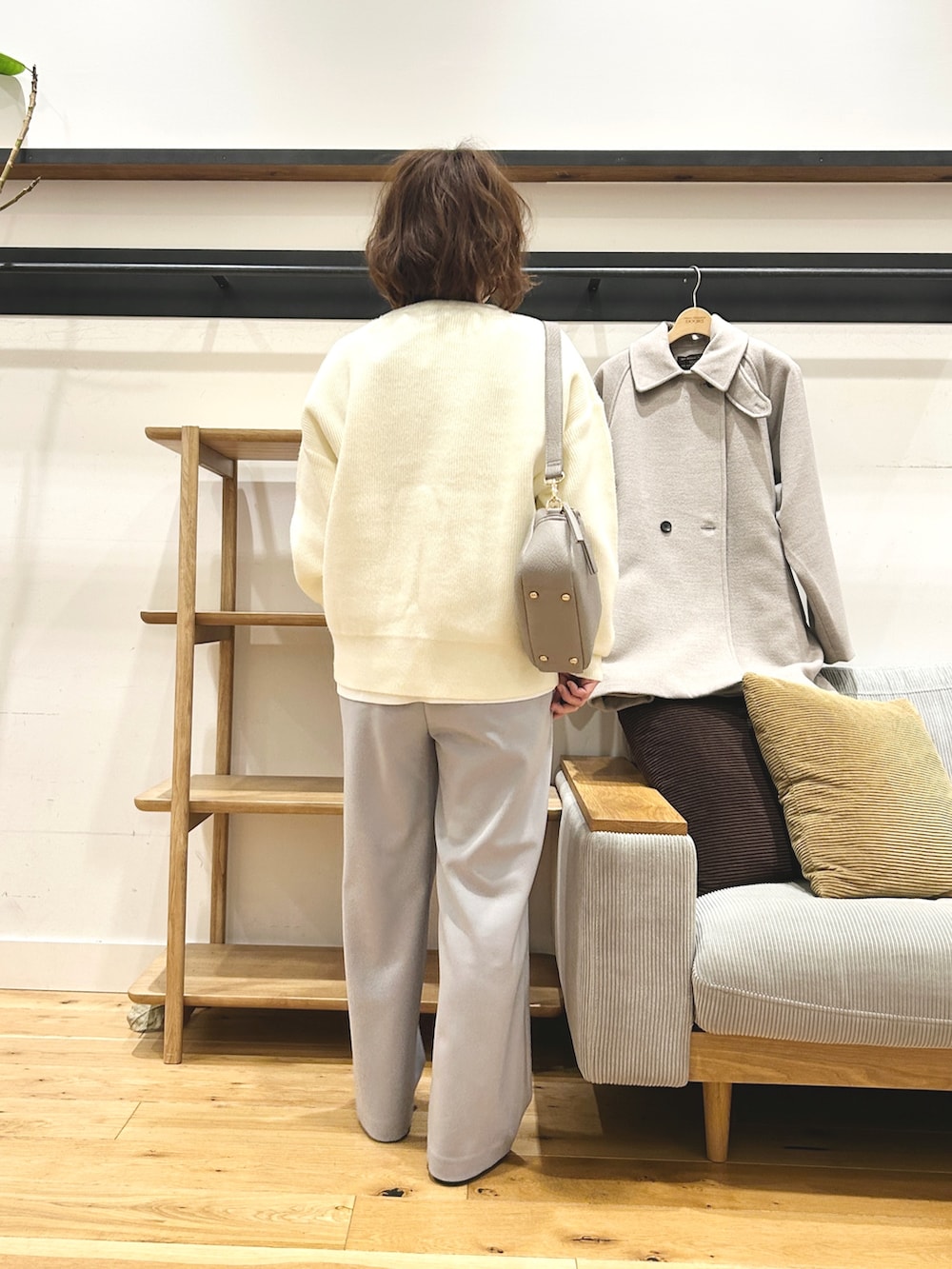 淡いカラーが冬のコーデを重たく見せず、デイリーに取り入れやすい一枚です。