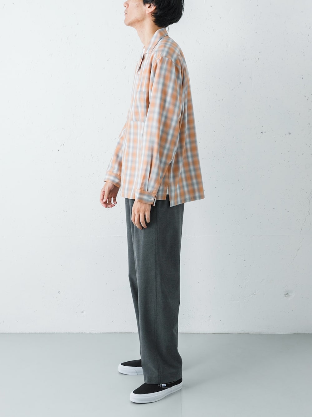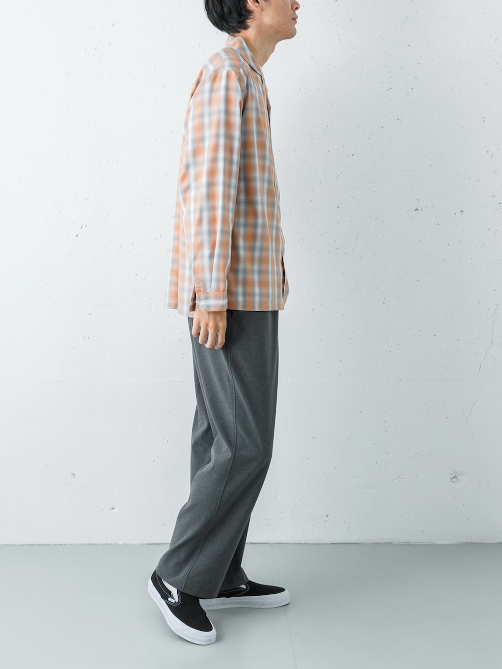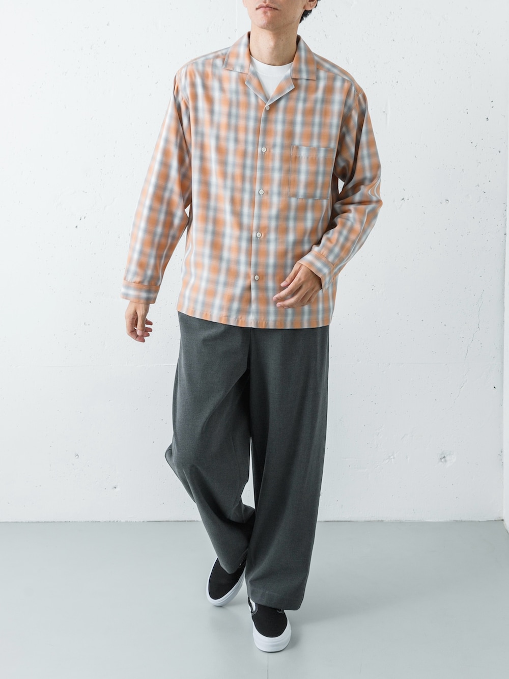 主役は、色気のあるグラデーションが目を惹くオレンジ系のオンブレチェックシャツ。グランジやアメカジの香りが漂うこの情緒的な暖色シャツに対し、ボトムスにはあえて無機質なグレーのハイスペックワイドパンツをセレクトしました。
