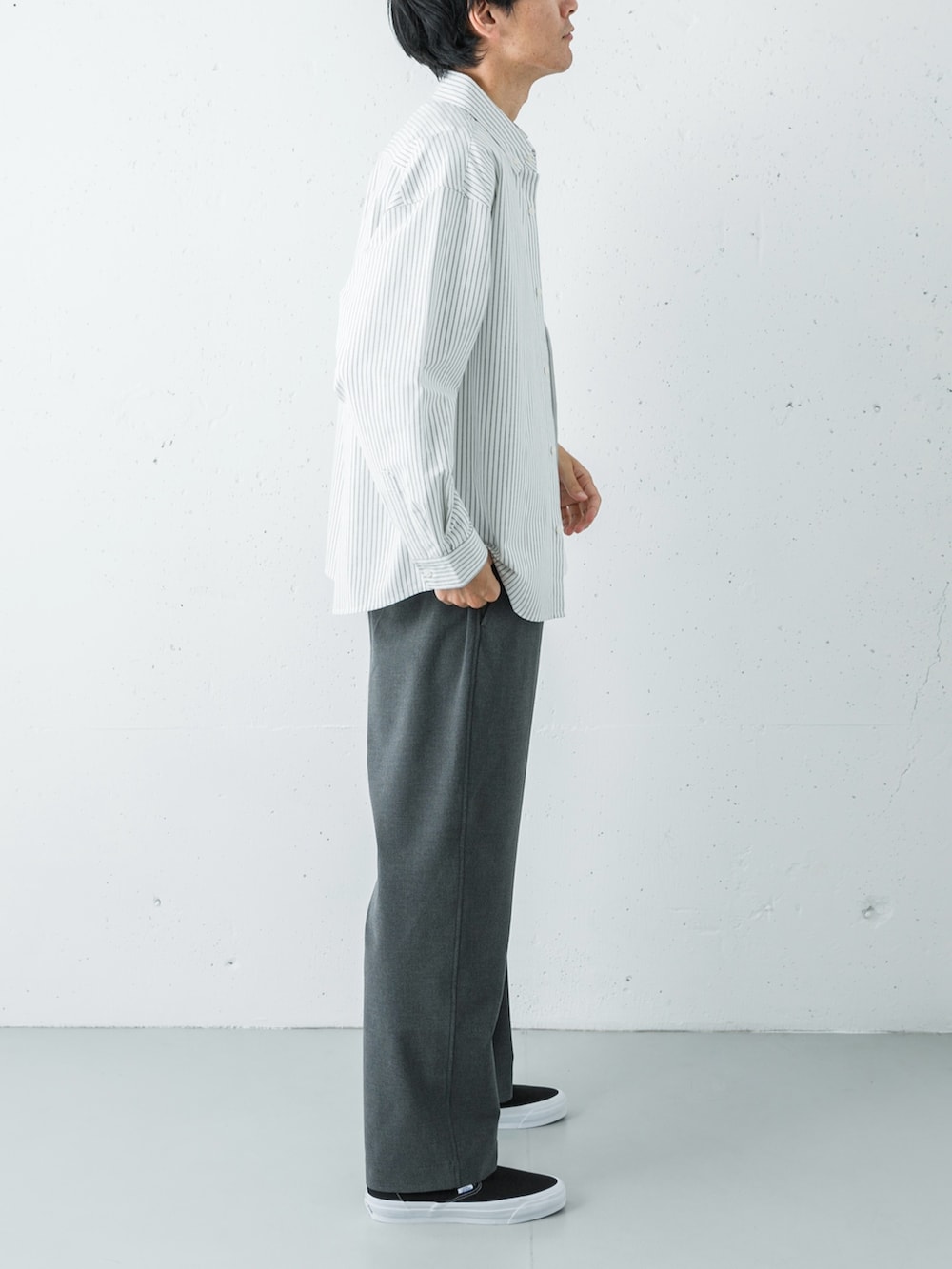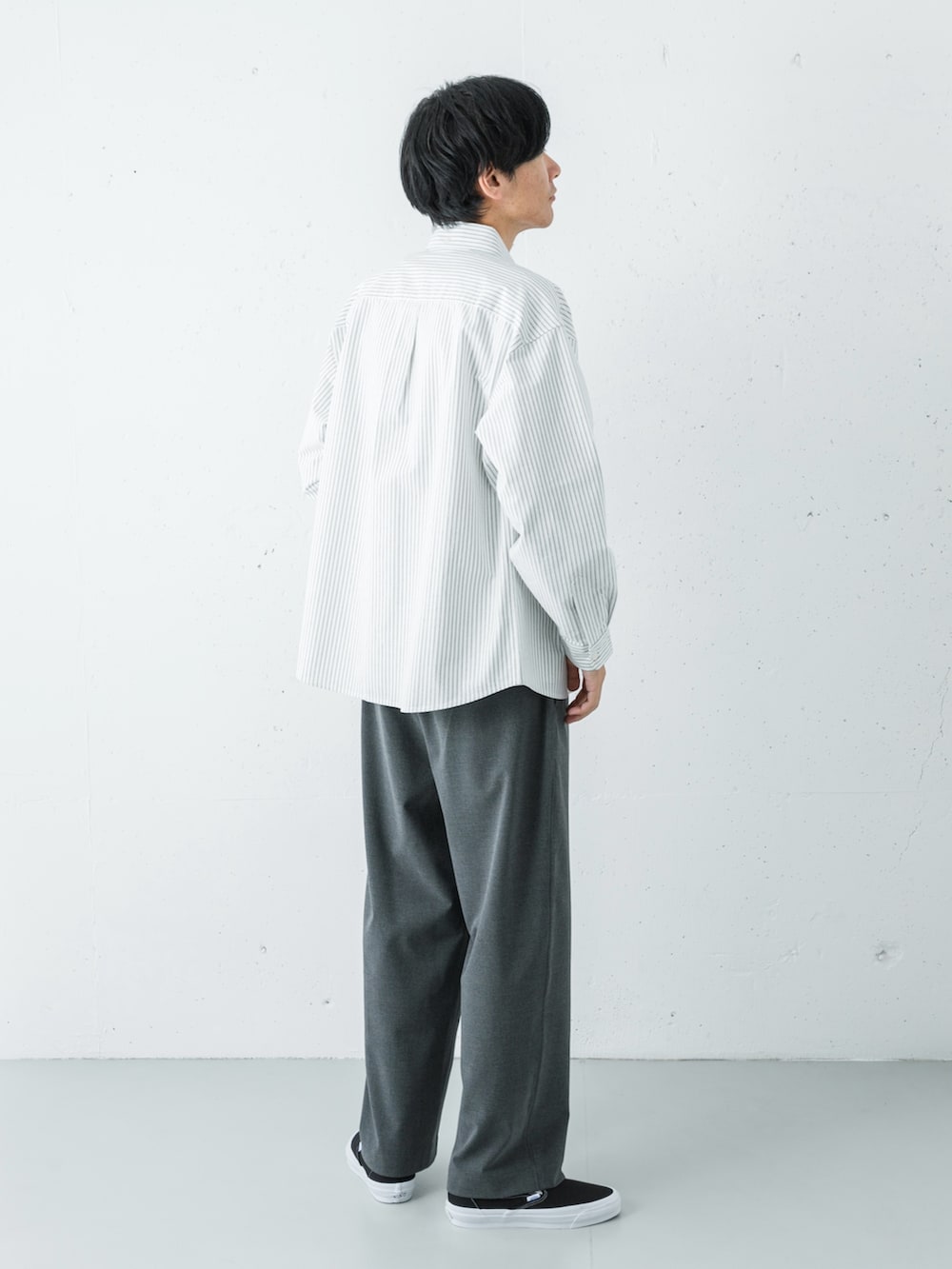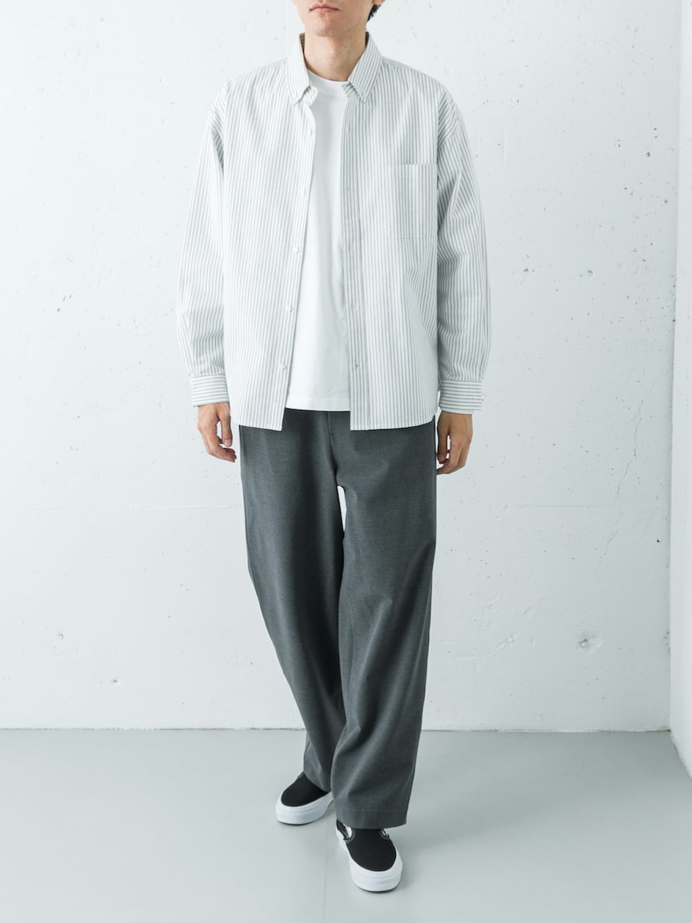 トップスは、トラッドな趣きを持つオックスフォードのボタンダウンシャツ。カラーは爽やかなオフストライプをセレクトしました。ベースがオフホワイトの柔らかなストライプは、無地以上に奥行きがあり、オーバーサイズのシルエットと相まって、空気を孕んだような軽やかな「抜け感」を演出します。「抗菌」という見えない機能性も、清潔感を後押しする重要なポイントです。
