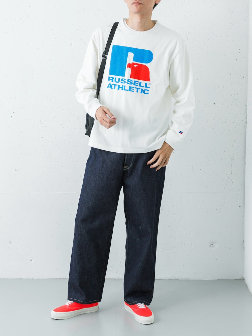 ベースは、RUSSELL ATHLETICのヘビーウェイトロンTと、Lee101のリジットデニムという、米国を代表する名門同士のタフな組み合わせ。肉厚な白Tシャツに、糊の効いた硬質な濃紺デニムを合わせることで、飾り気のない男らしいシルエットを構築しています。