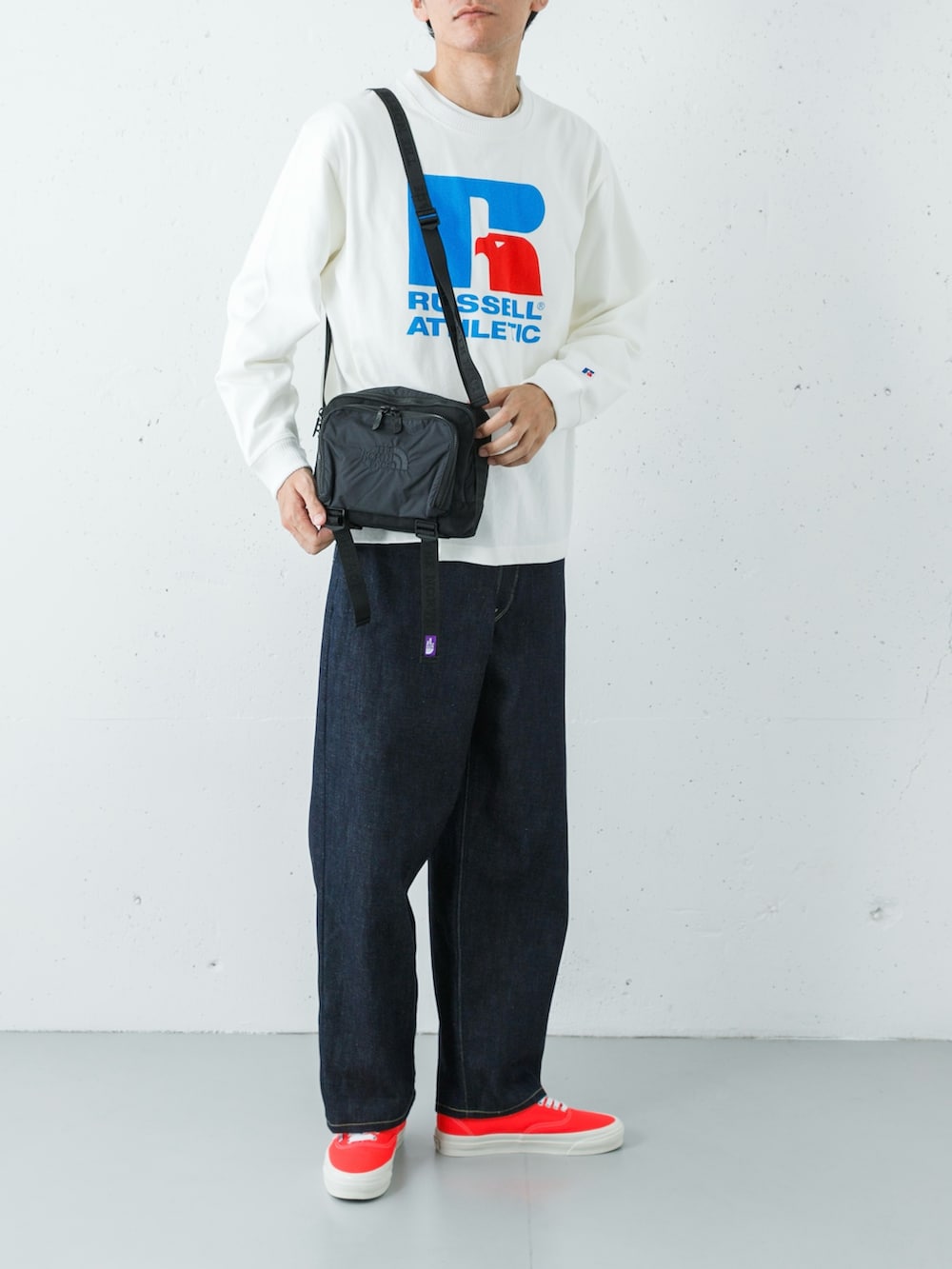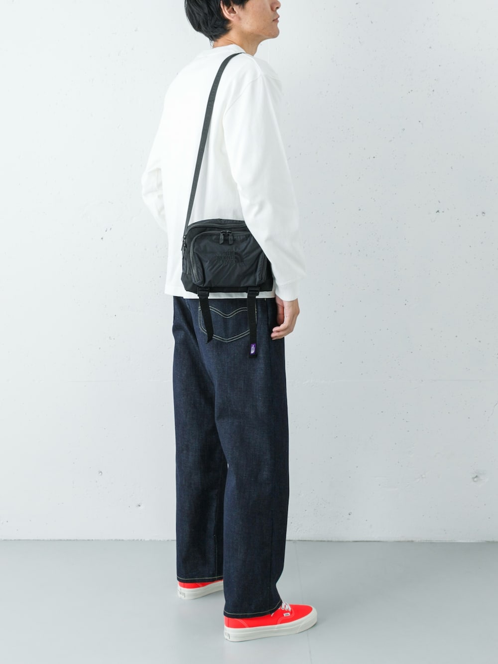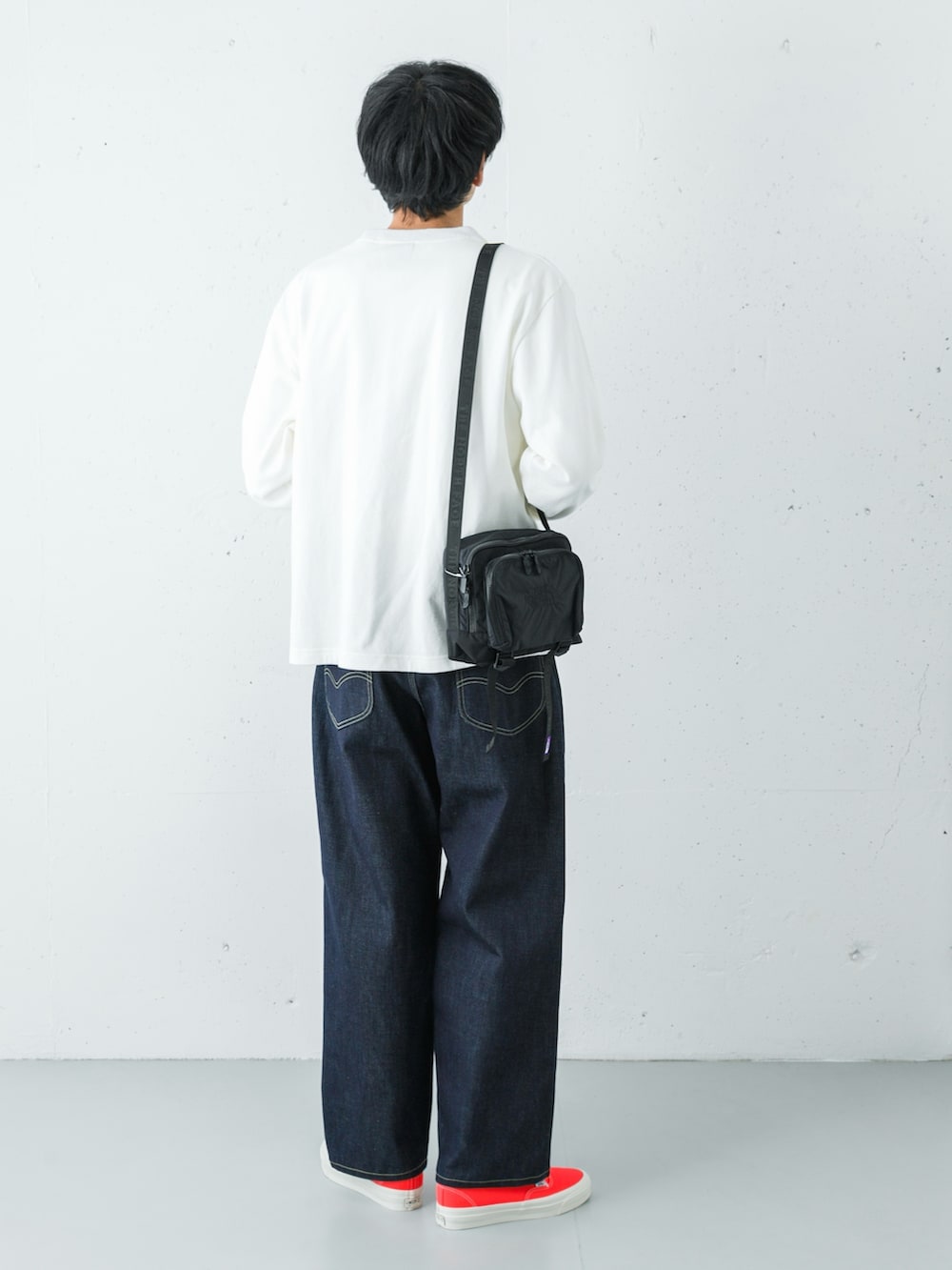 ここに、THE NORTH FACE PURPLE LABELの黒ショルダーバッグをプラス。斜め掛けせず、あえて「肩にサラッと掛ける」ことで、リラックスした大人の余裕を演出しています。バッグのストラップが作る縦のラインが、ワイドなデニムスタイルをすっきりと見せる効果も。
