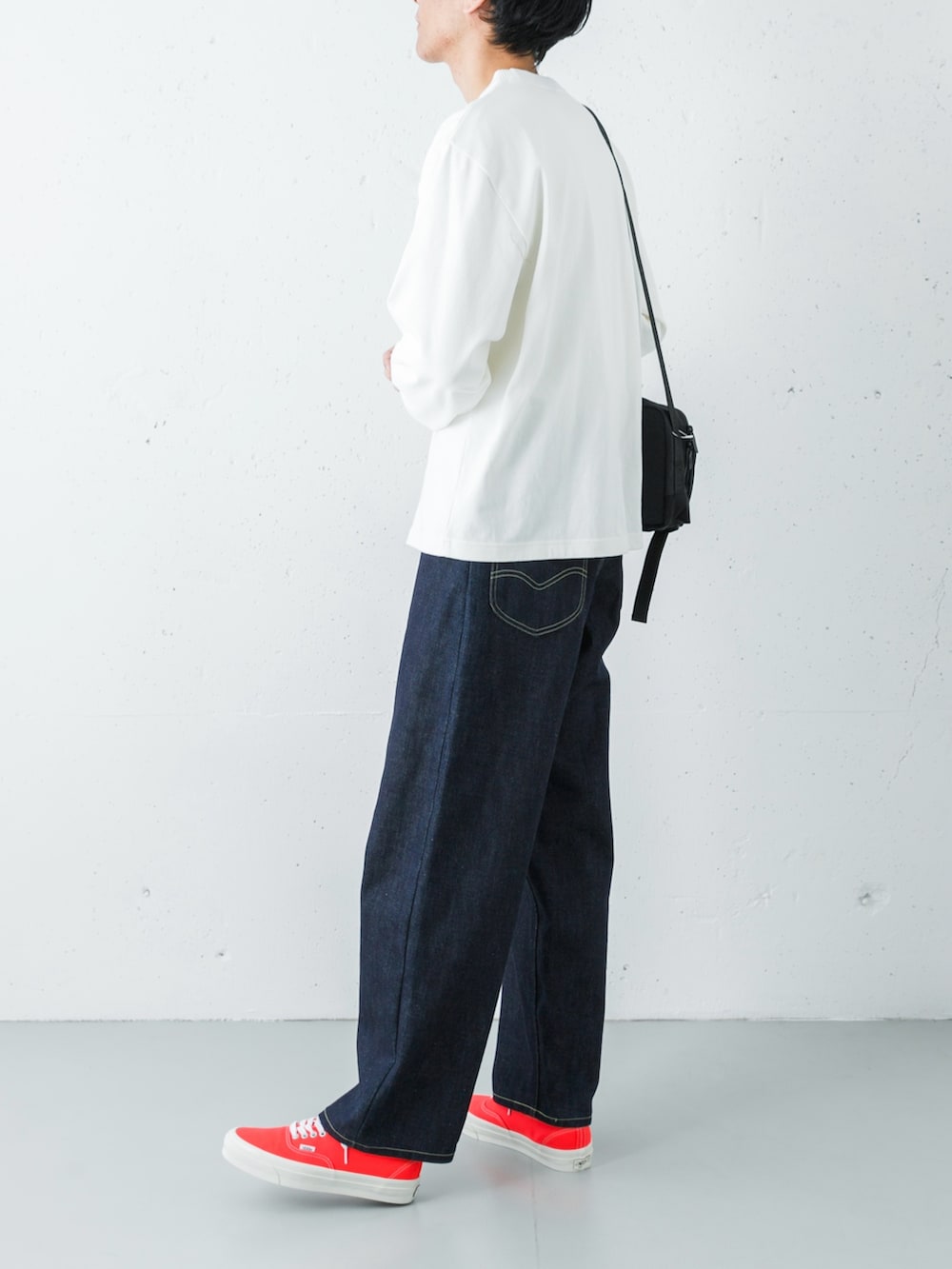 足元は、VANS LX AUTHENTICの「ディーバピンク」。インディゴブルーとブラックでまとめた硬派なスタイルの足元に、あえて鮮烈なピンクを差す。バッグをラフに持つ仕草と相まって、キメすぎない「隙」を作った、非常に感度の高いストリート・スタイルです。