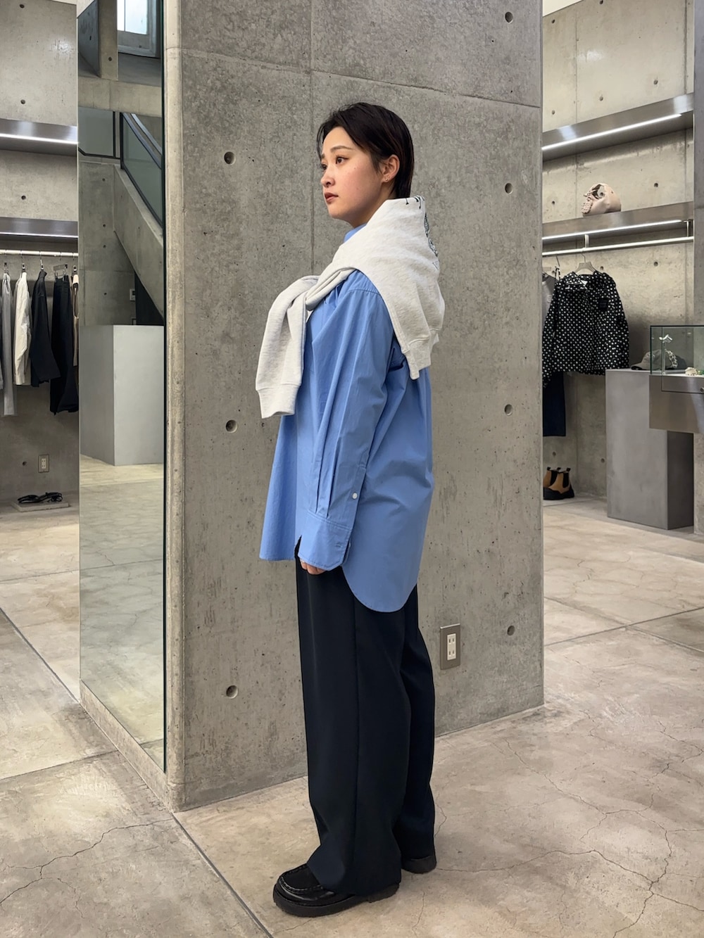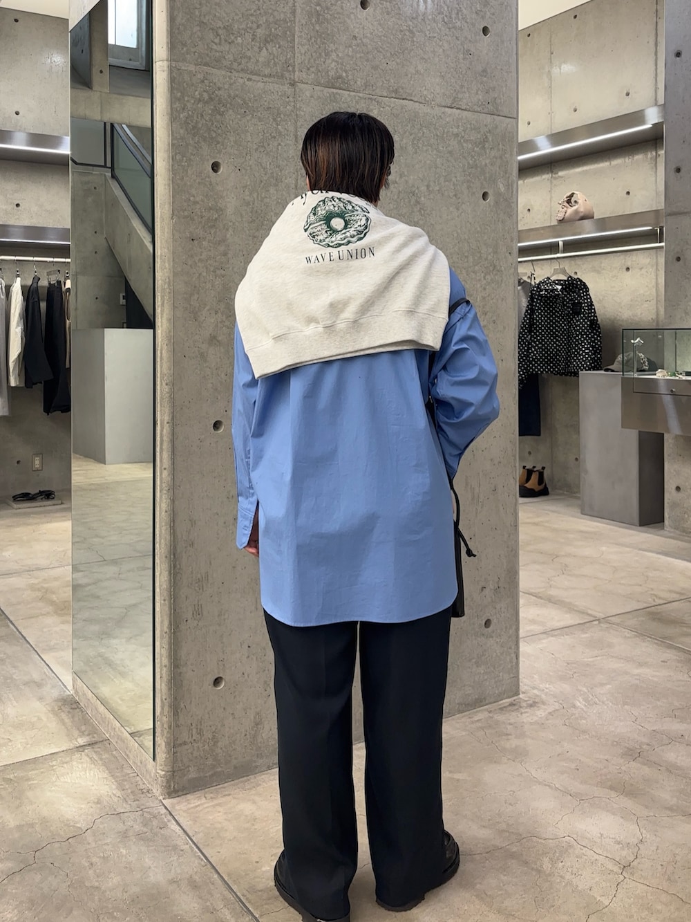 肩がけしたスウェットは、寒い時にシャツの上から重ね着しても◎