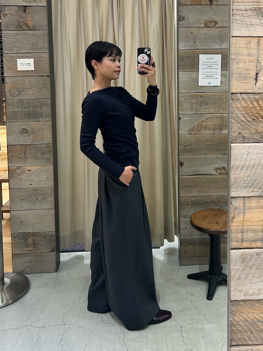 お客様に人気のストレッチタックギャザーパンツ🩶太みのシルエットですが、生地感が柔らかくストンと落ちるので腰やヒップ周りがすっきり見えるアイテムです✨