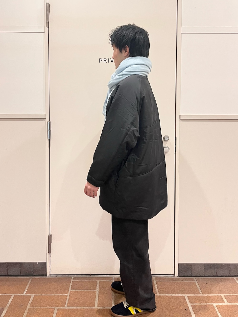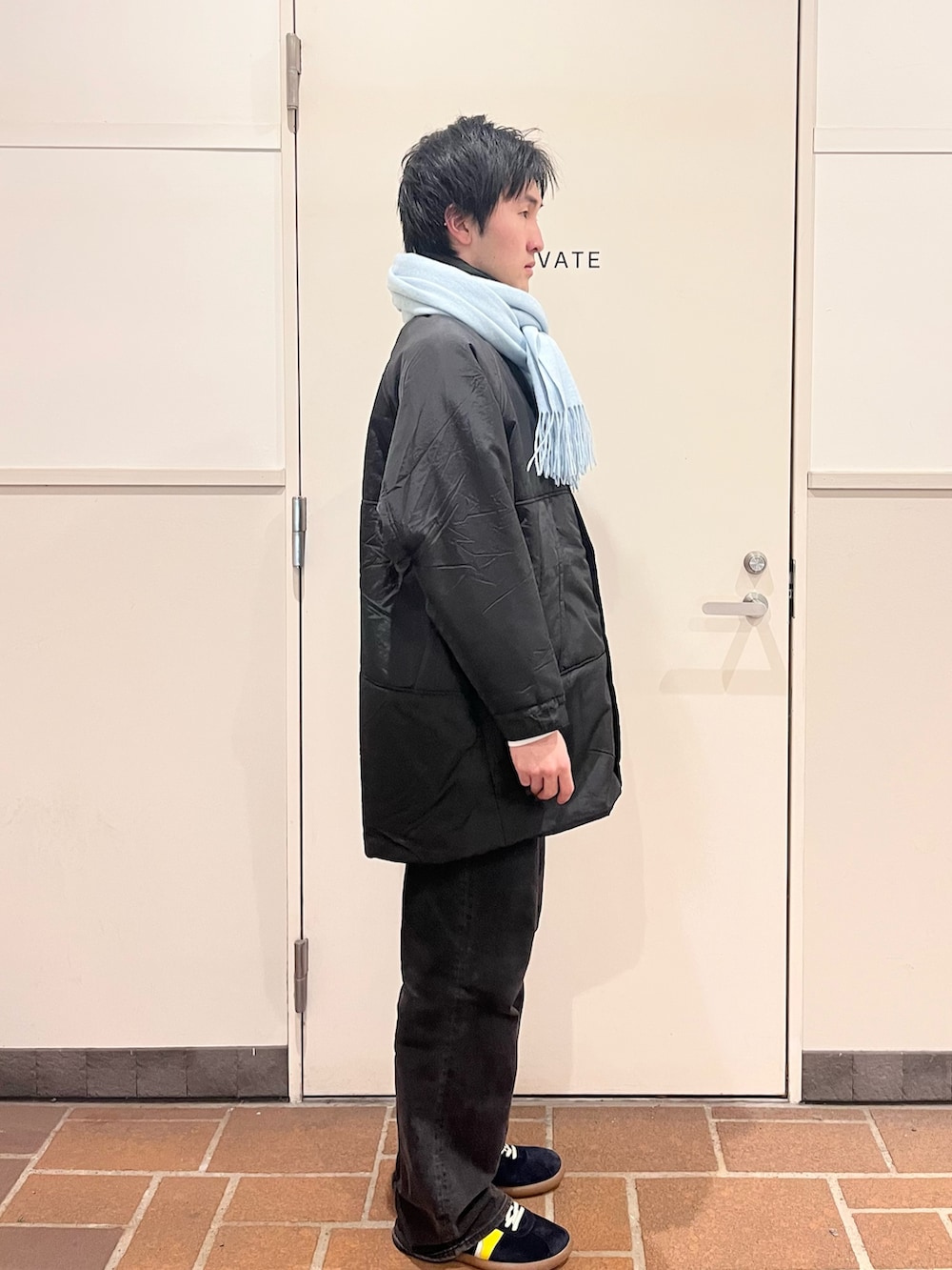 差し色に水色マフラーも