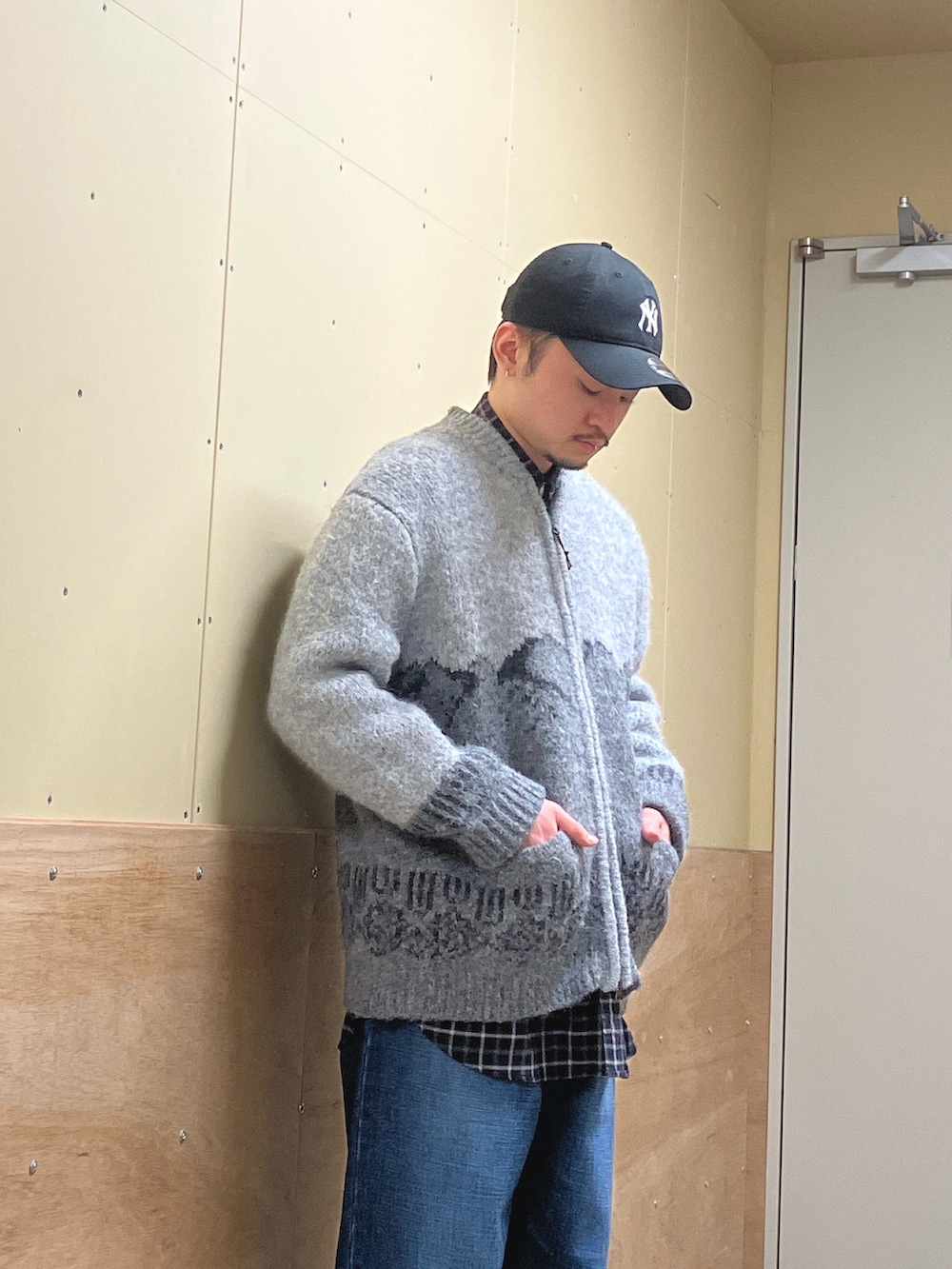 蓼科の景色が全面に入ったニットが目を惹きます。大きめのサイズ感なのでパンツもゆったりとしたサイズ感のLeeの別注Cowboyパンツと合わせています。