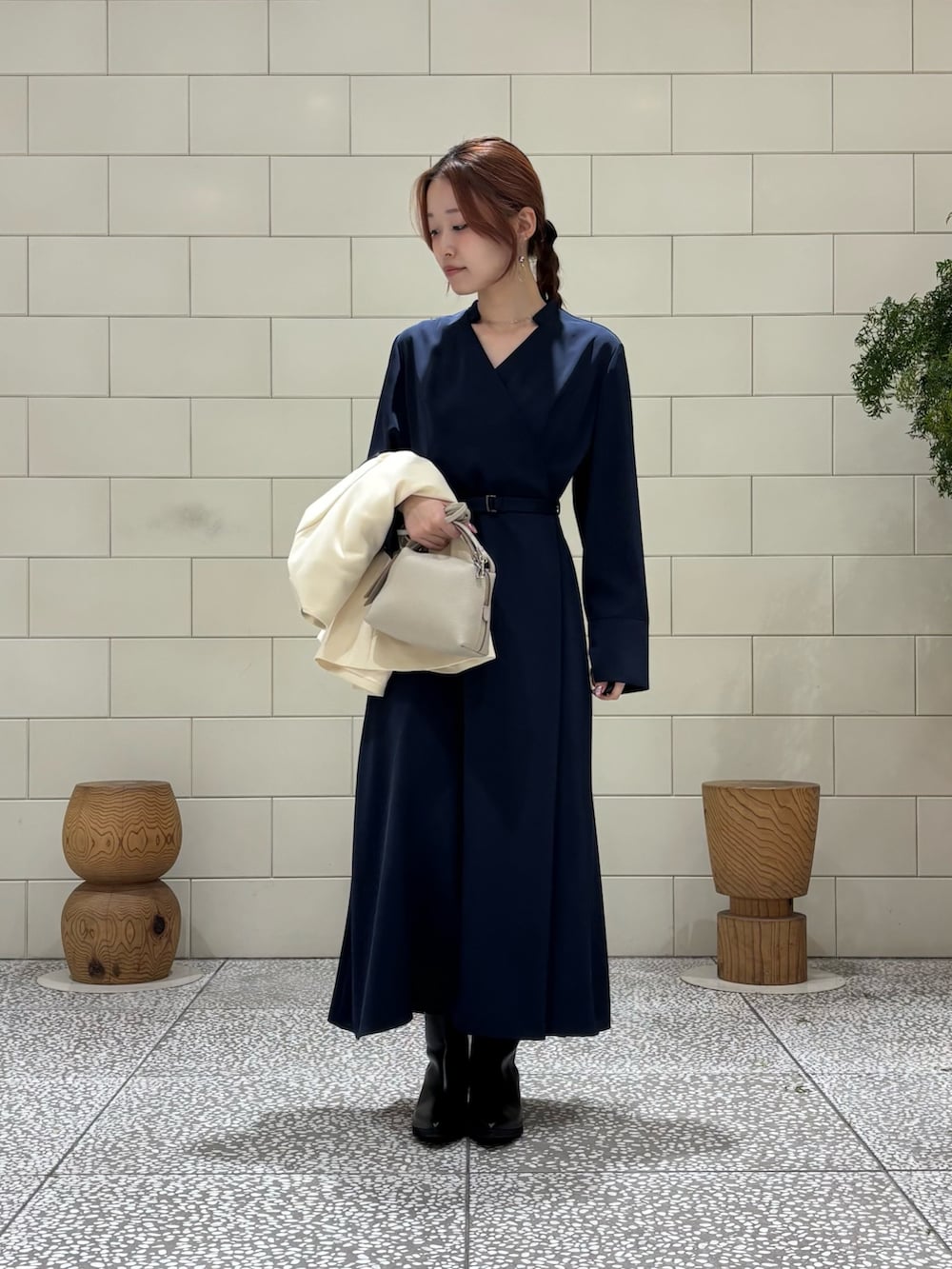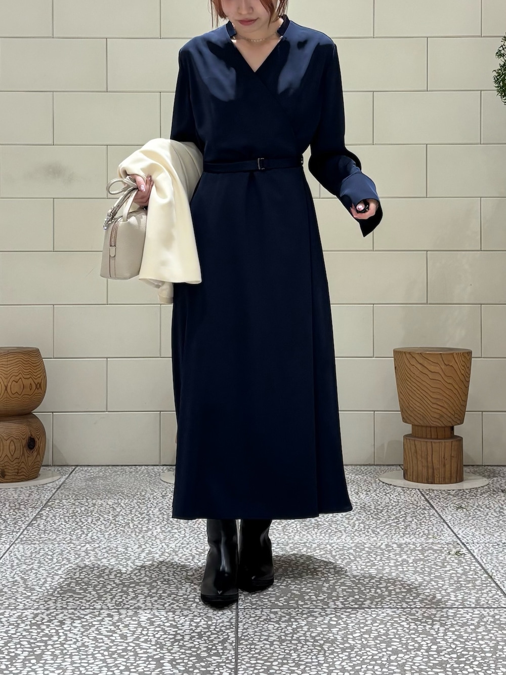 セレモニーにおすすめのベルト付きワンピースです。首元のVネックが爽やかな印象を与えてくれます。デイリーでも使いやすいデザインです。