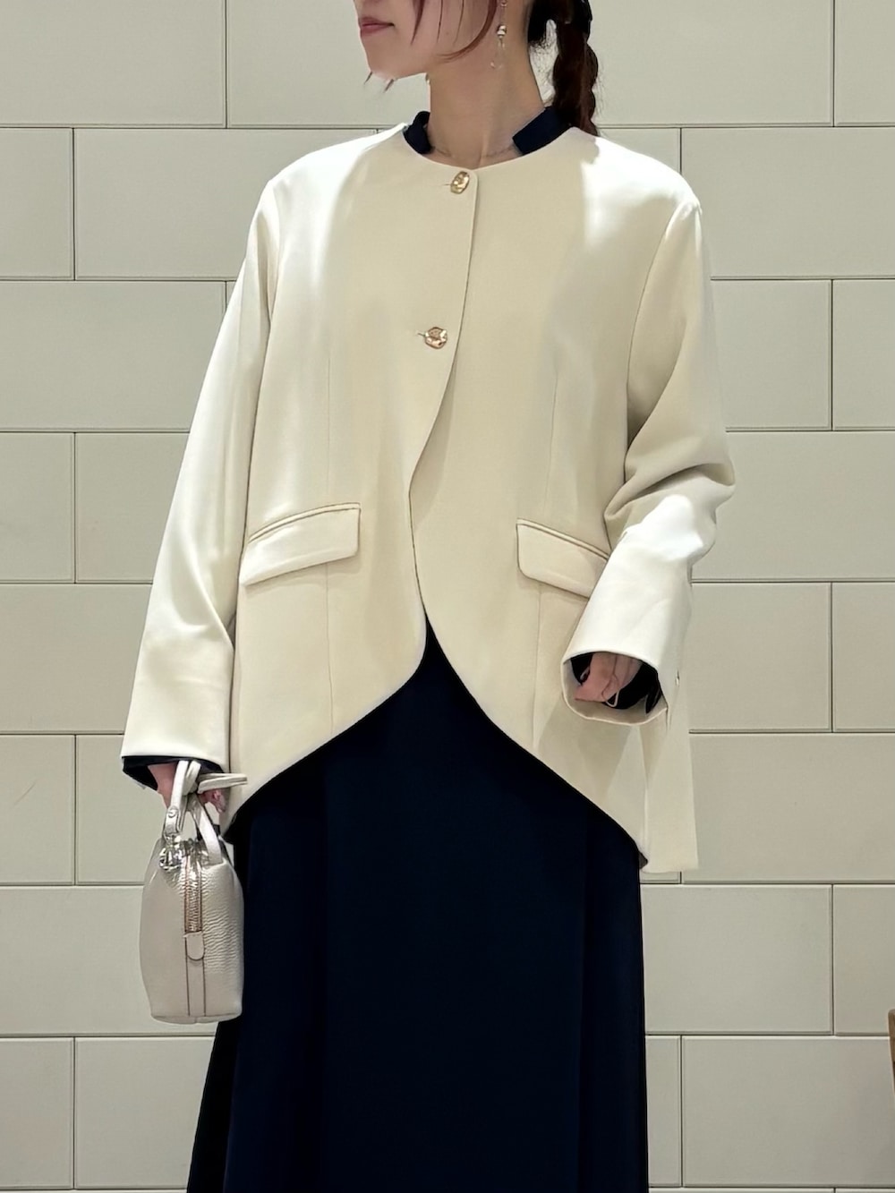 デザイン性のある別注ジャケットです。モチーフのあるゴールドボタンが上品で華やかにスタイリングをまとめてくれます。