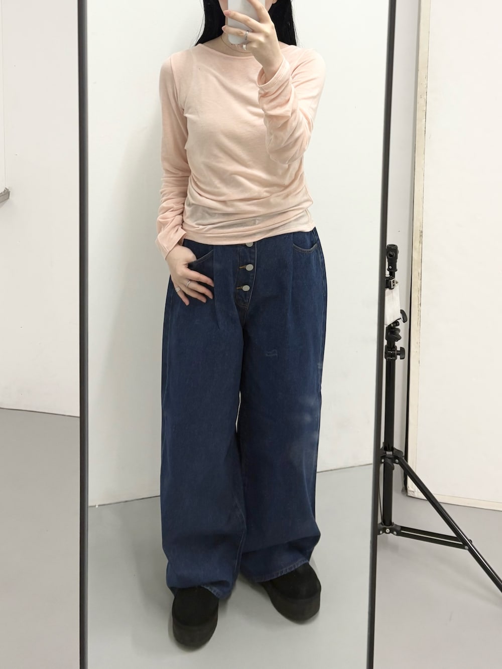 デニムはウエスト部分がサイズ調節可能なので、ハイウエストでも、少し落とし気味でも着用できるので雰囲気が変えられます◎