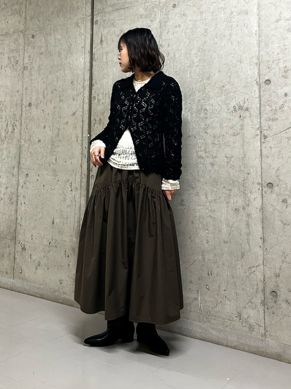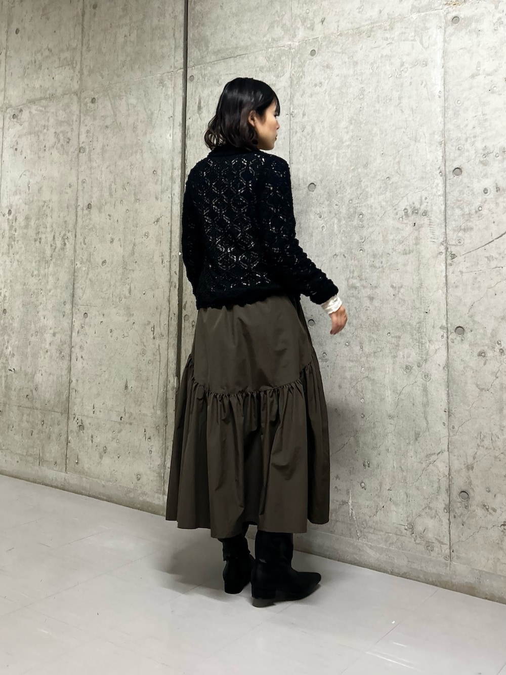スカートはふわっと可愛いシルエットとカーキの大人っぽい色味のバランスが◎