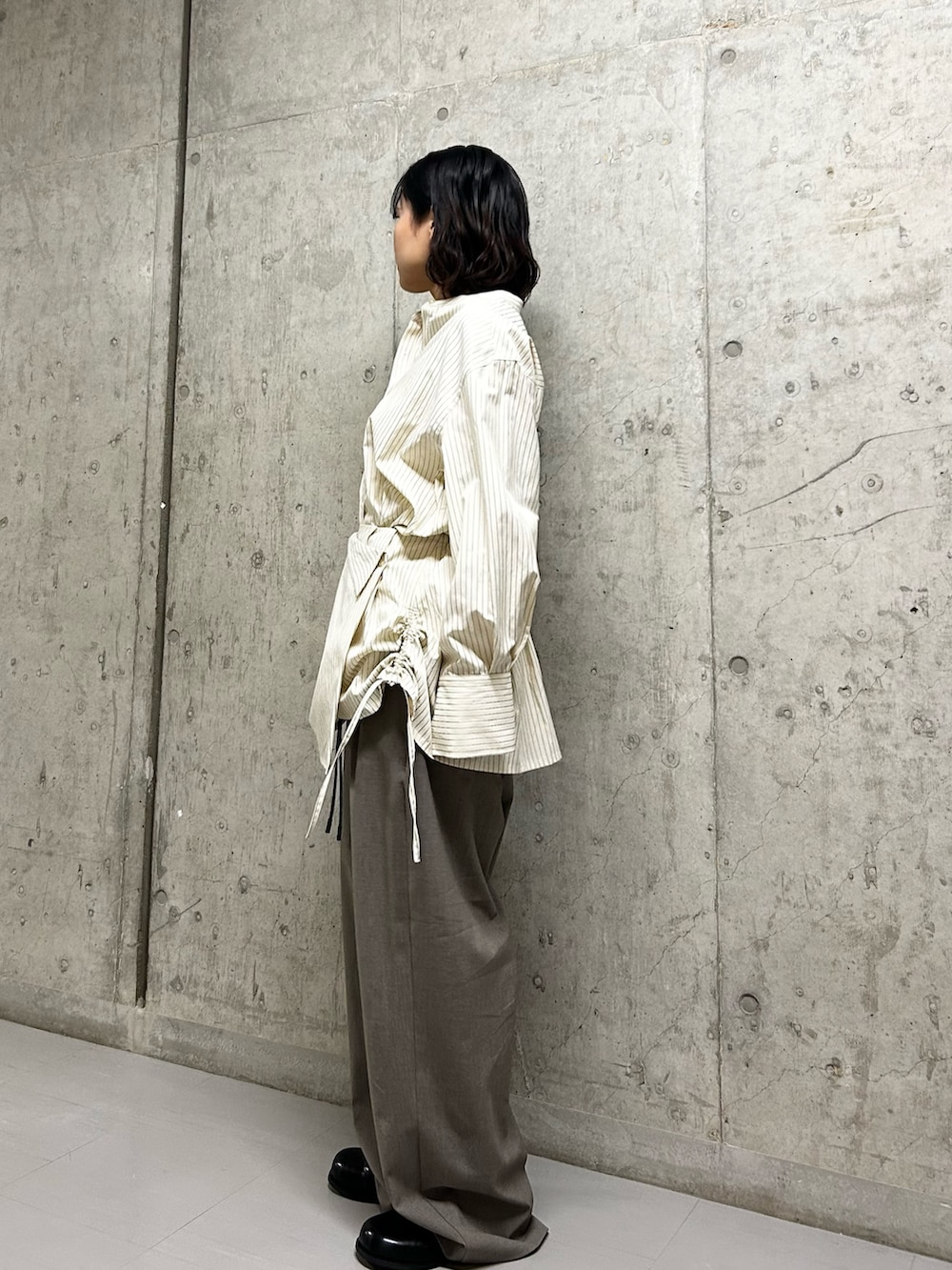 パンツはお色味が絶妙なスラックス!やわらかい生地感で履き心地◎、ベルト付きなので履くだけでコーデにこなれ感がでますよ✨️