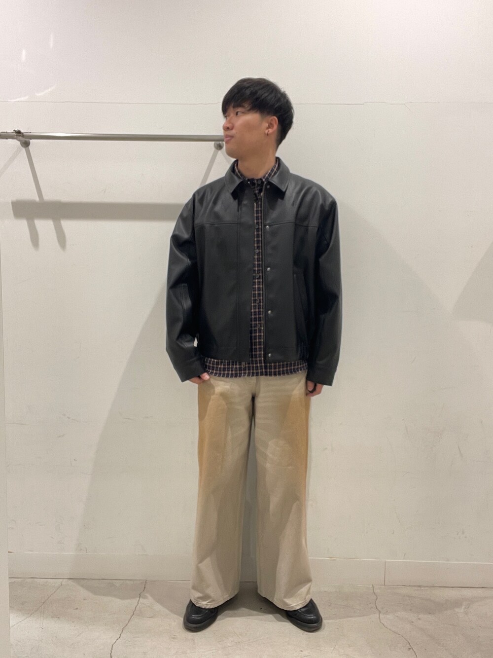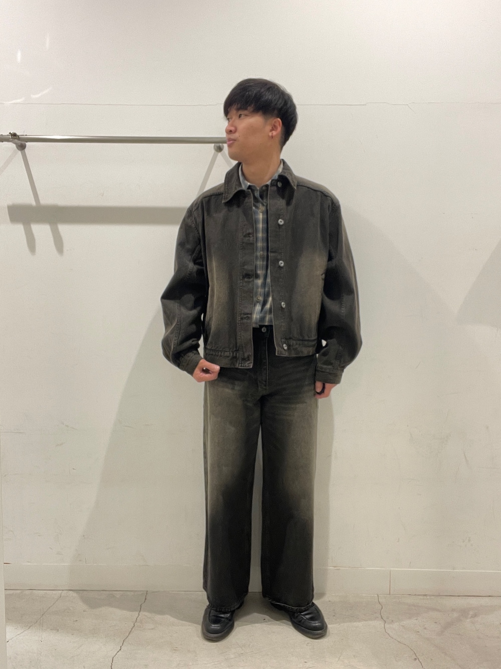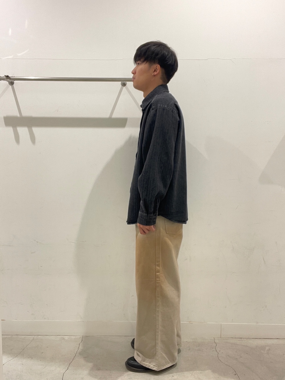 黒デニムシャツにベージュデニム。