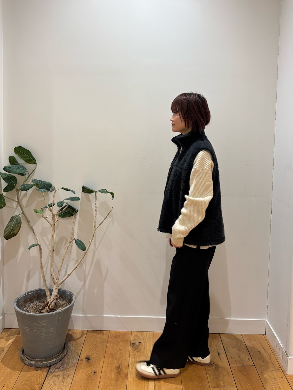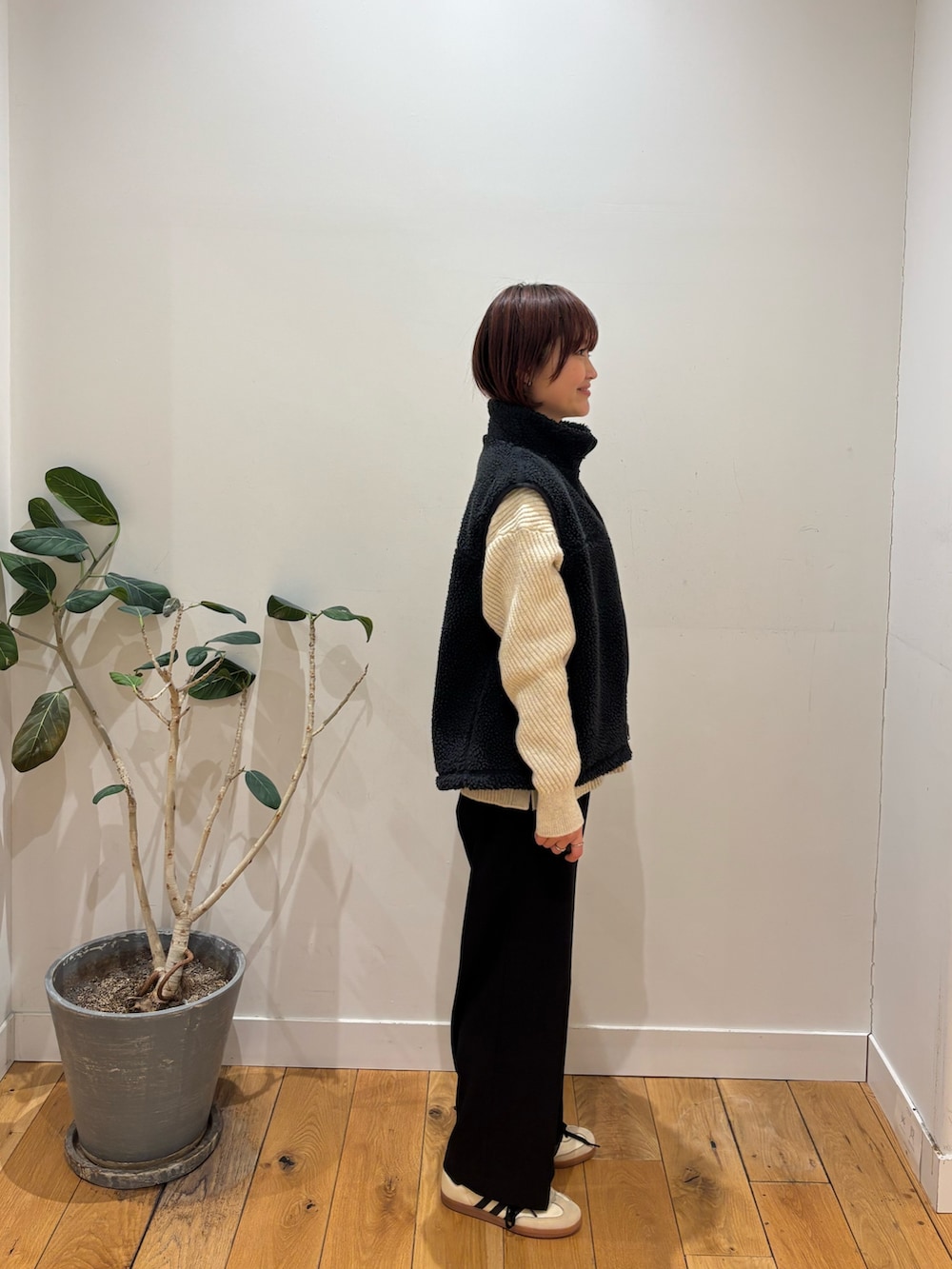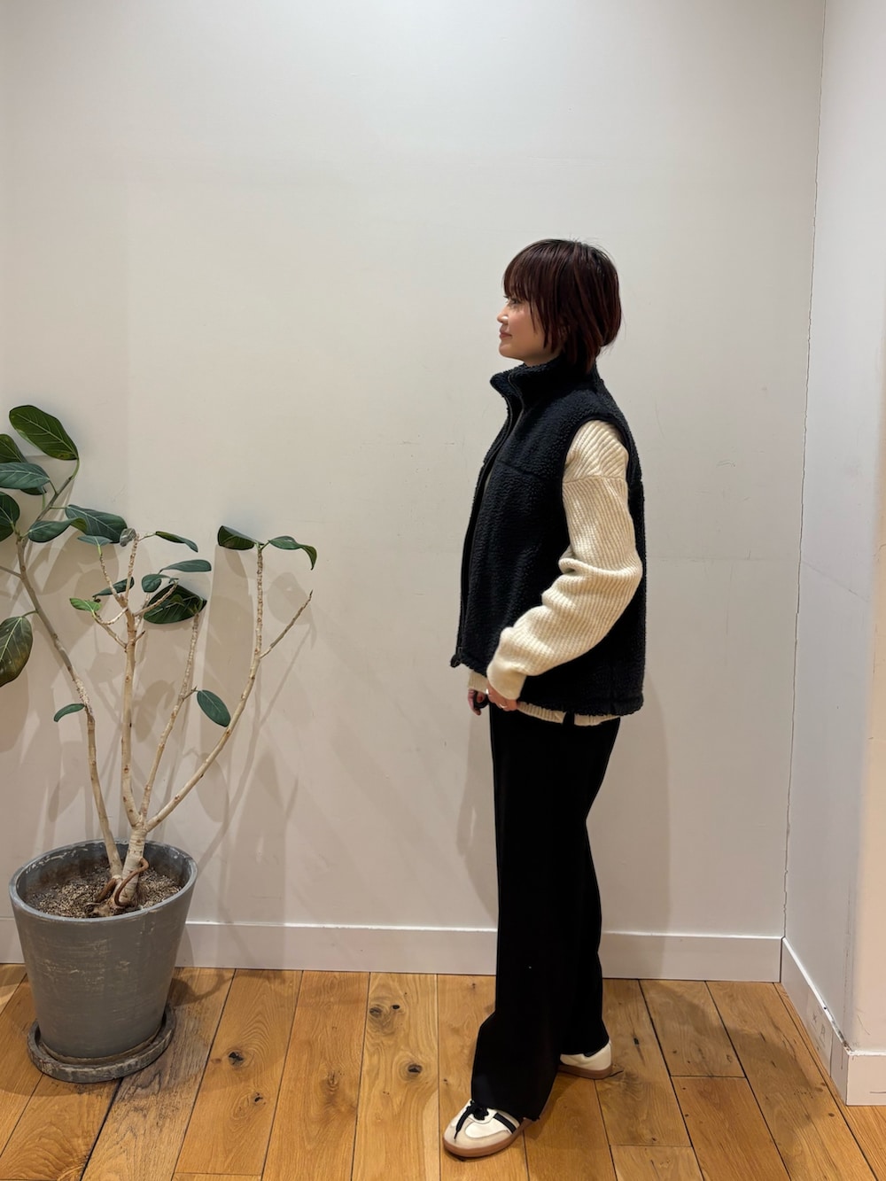 ベージュと黒合わせでコーデを組んでみました!着用しているボアベストは肩周りがゆったりしているので肉厚なセーターやスウェットを着ていただいてももこもこせず着ていただけますよ◎