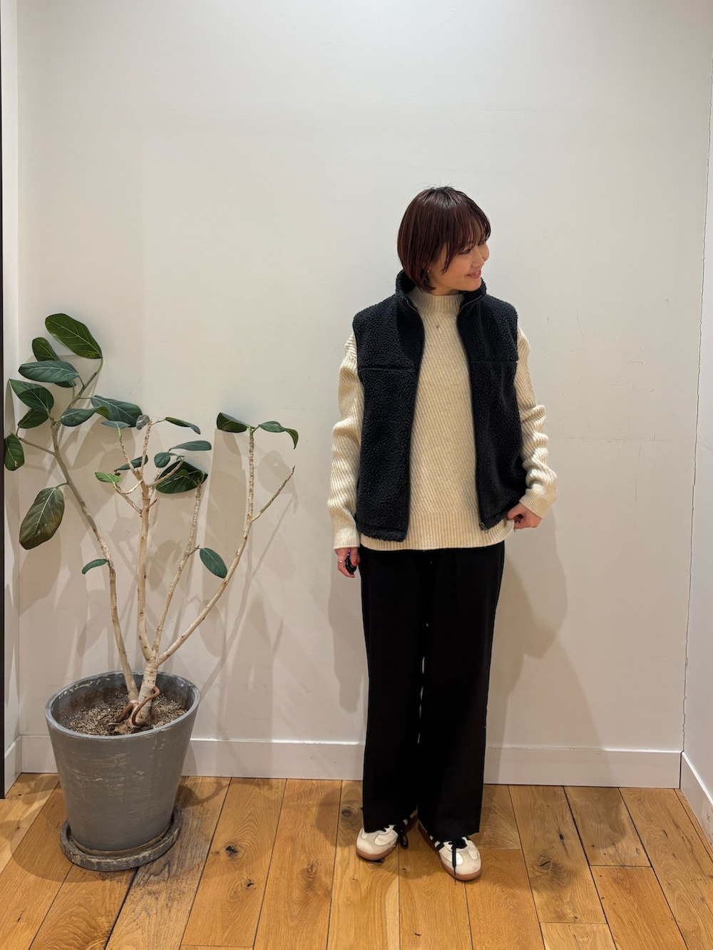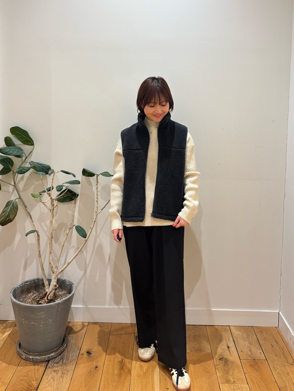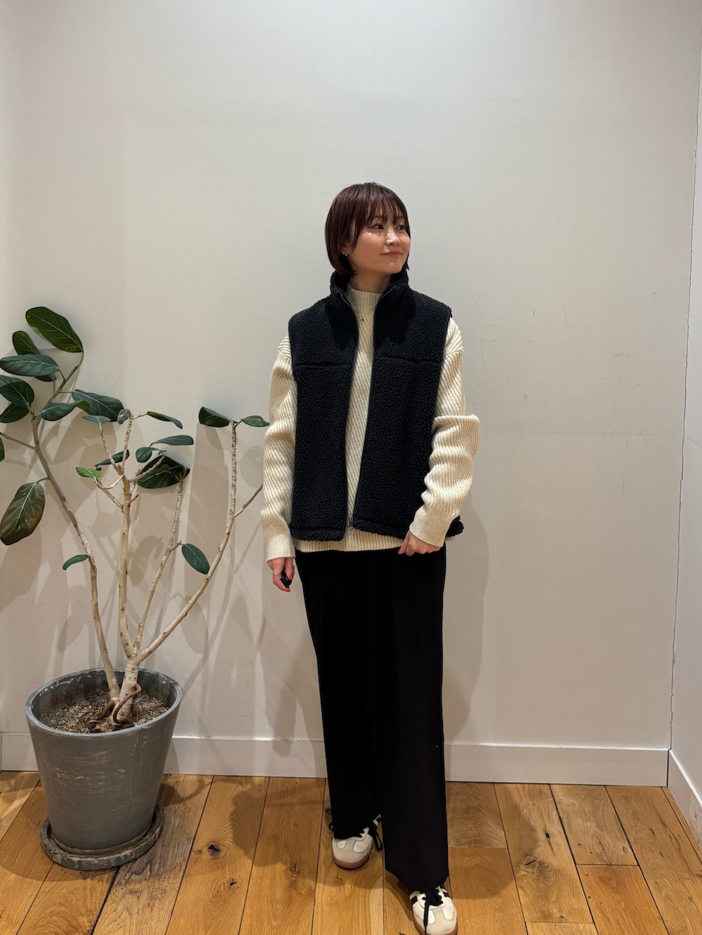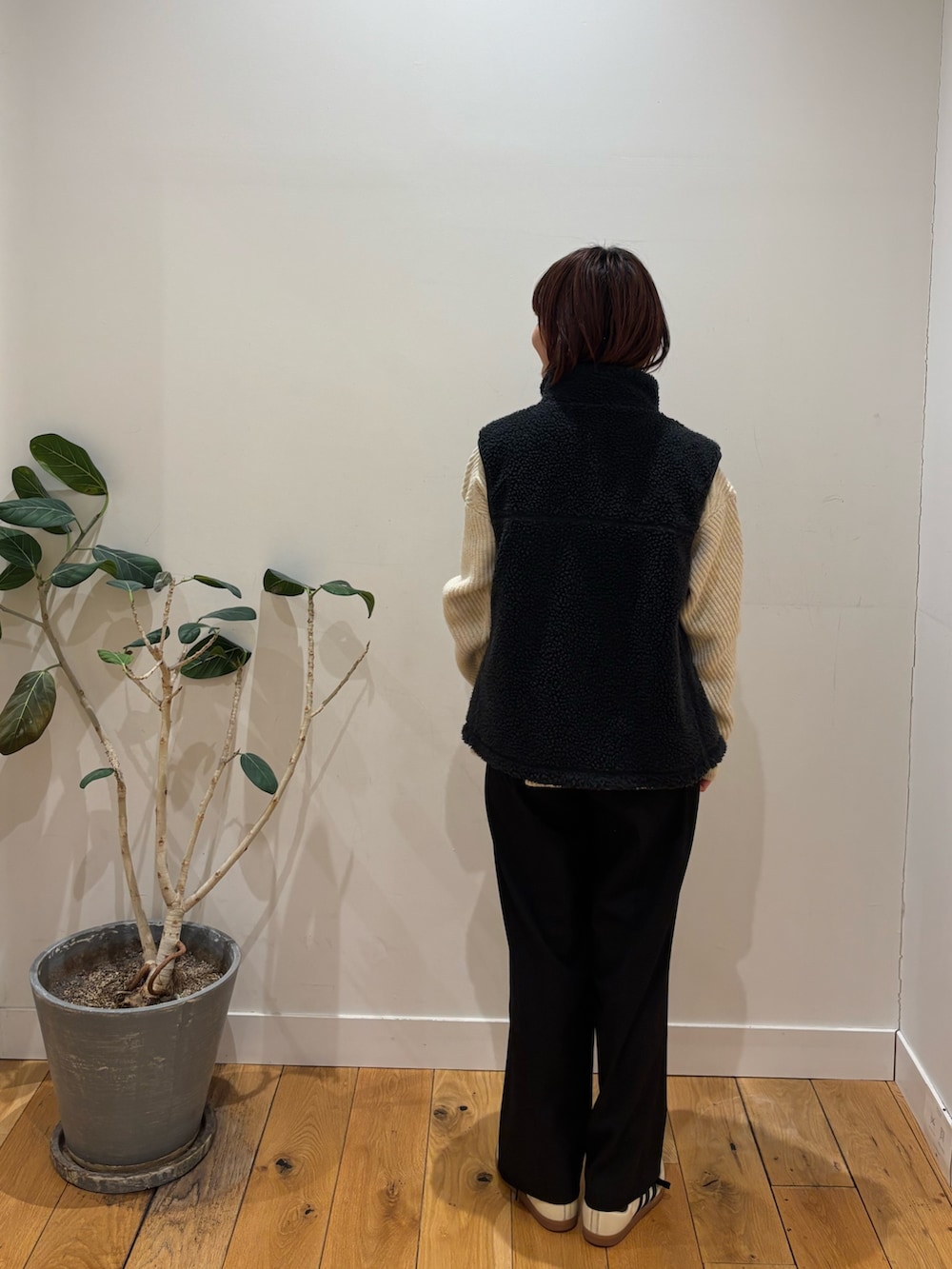 ベージュと黒合わせでコーデを組んでみました!着用しているボアベストは肩周りがゆったりしているので肉厚なセーターやスウェットを着ていただいてももこもこせず着ていただけますよ◎