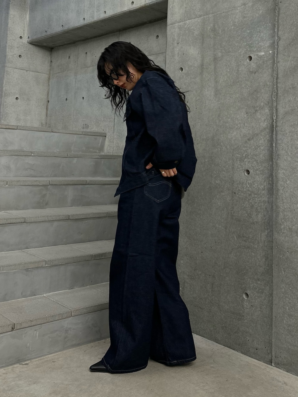 バギーパンツは生地が柔らかいぶん、着膨れしすぎずすっきりとした印象に。