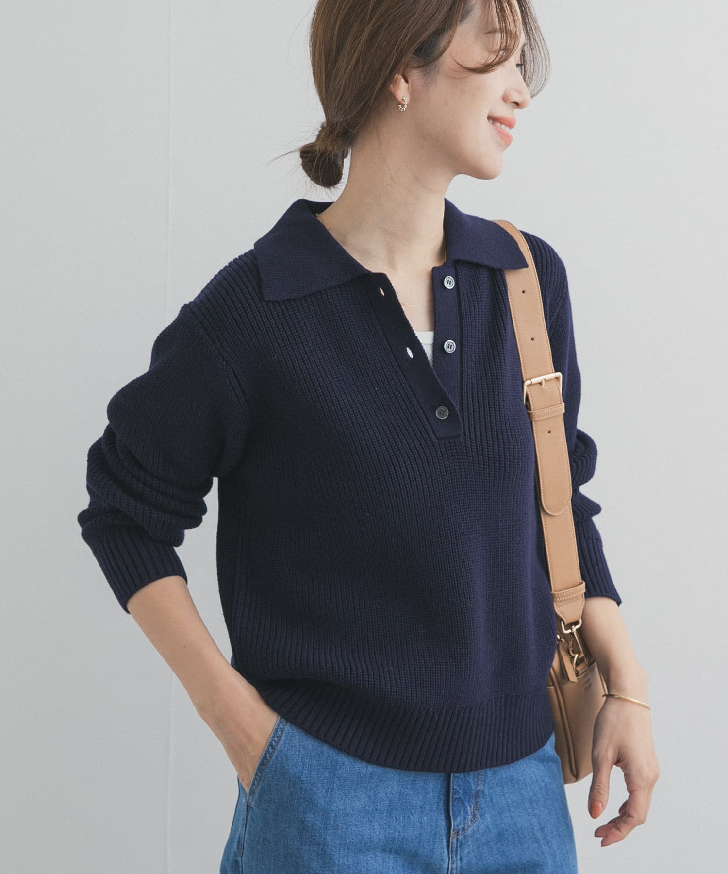 トレンド感ある襟付きニットはドライタッチ