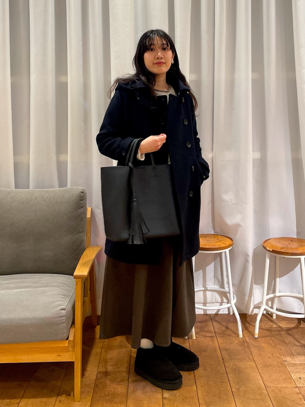 ショールカラーロングコートと合わせると、