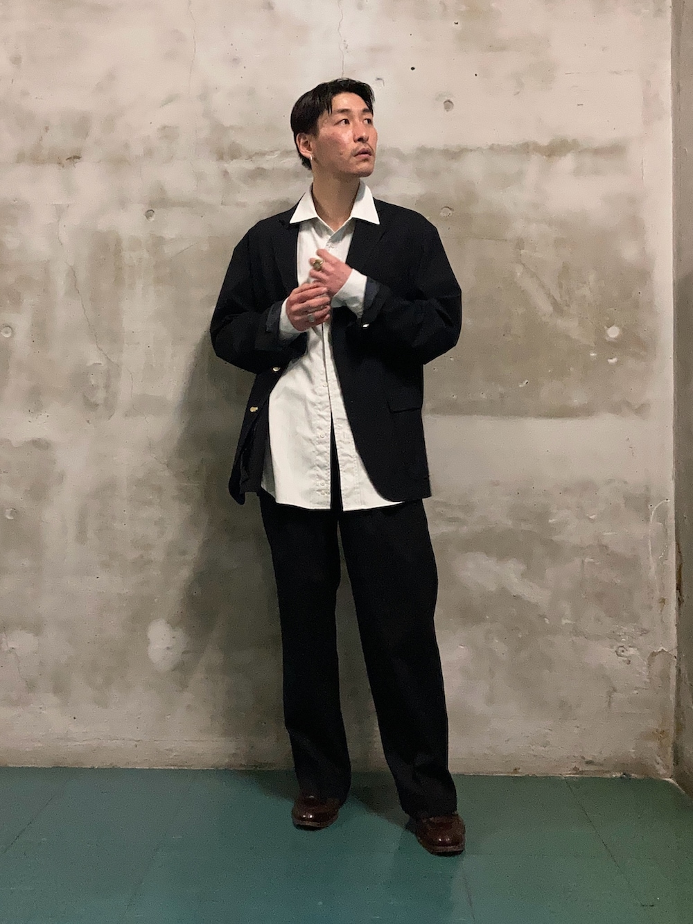 組上は金ボタンのブーレザーで、パンツは1アウトタック入りのイージーパンツ。