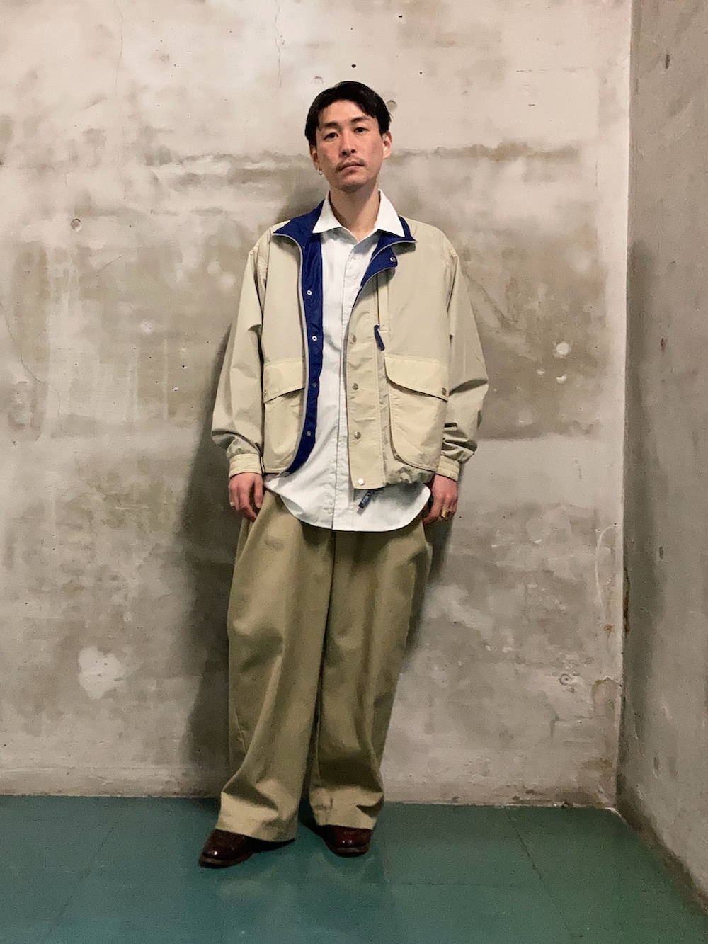 インナーにオックスフォードシャツで、パンツは私物で恐縮ですが、激太のディッキーズ。