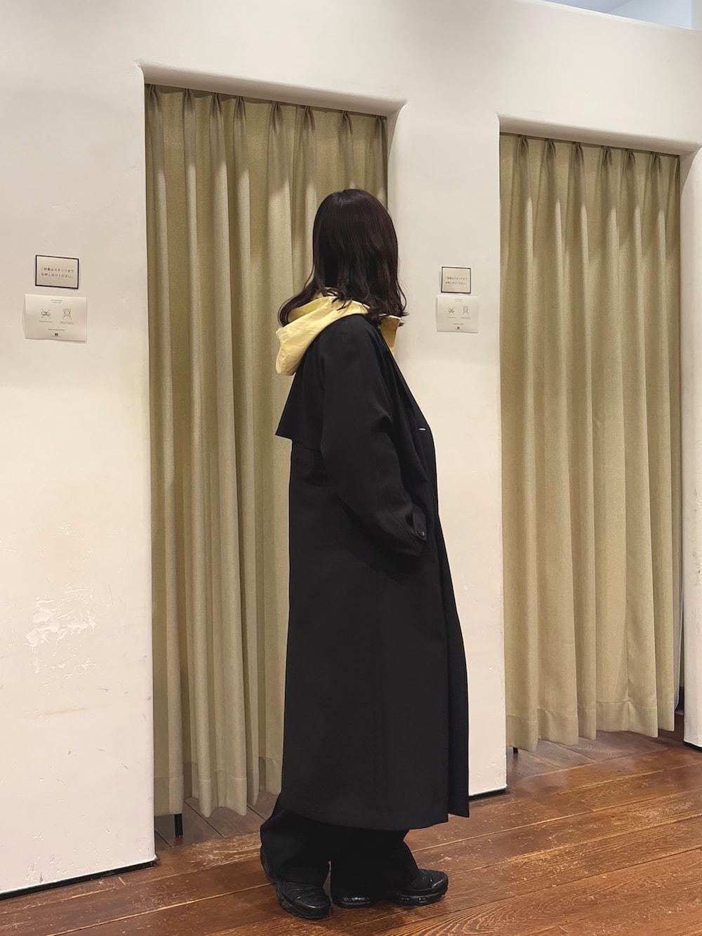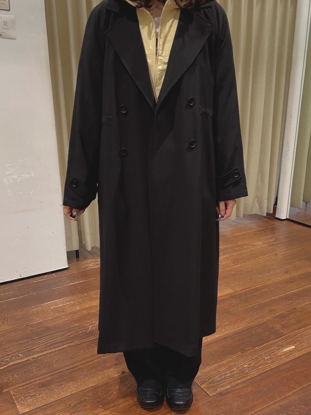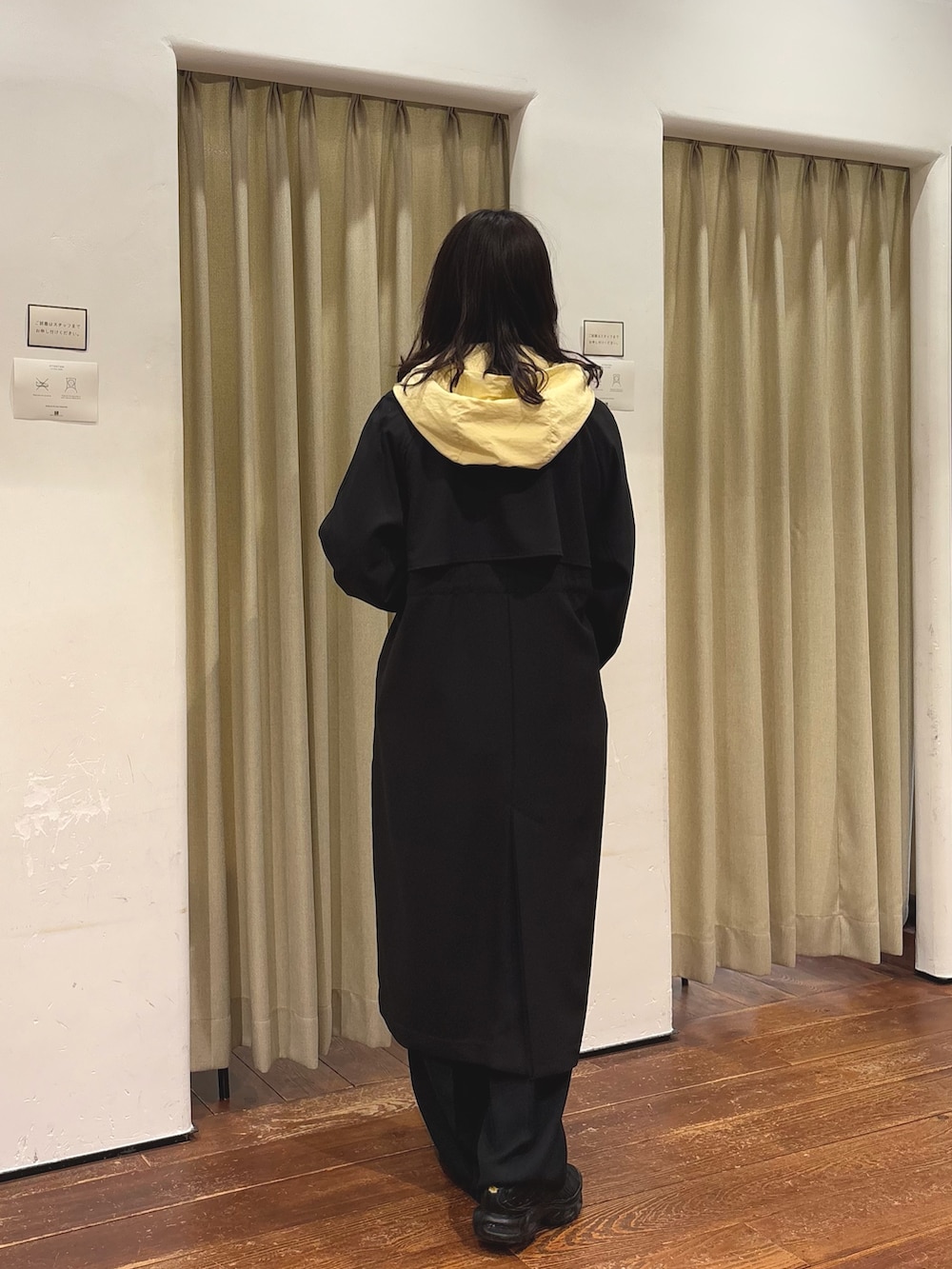 コートは、後ろ姿も綺麗で、ドロストを絞るとウエストマークできるのが特徴です。サイズは38を着用しております。