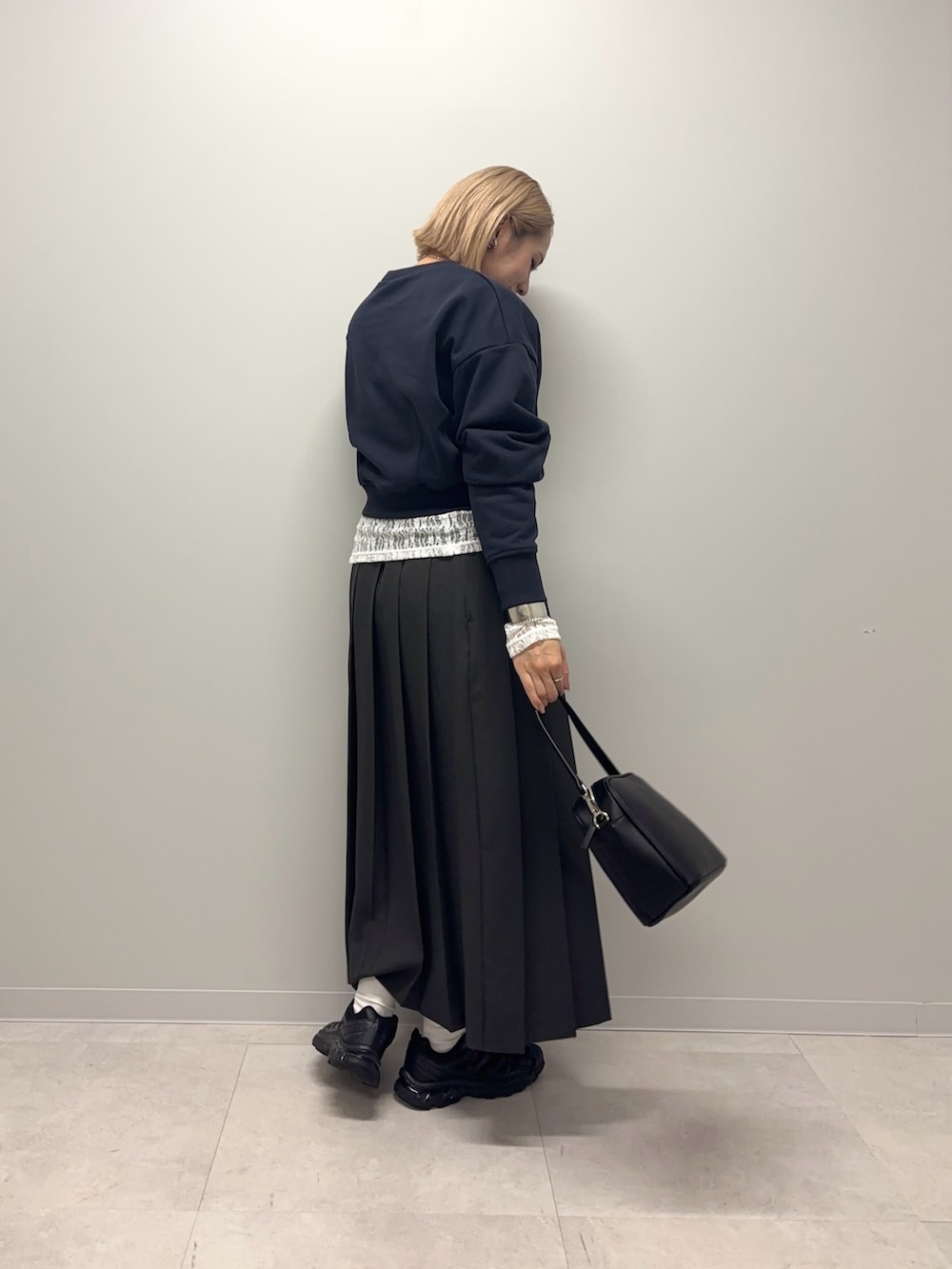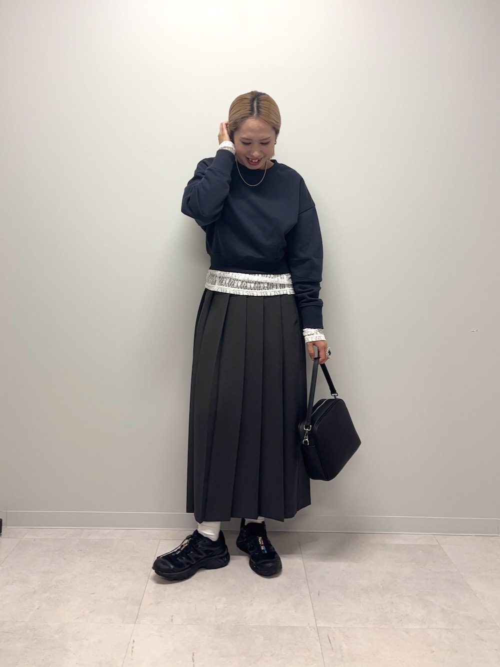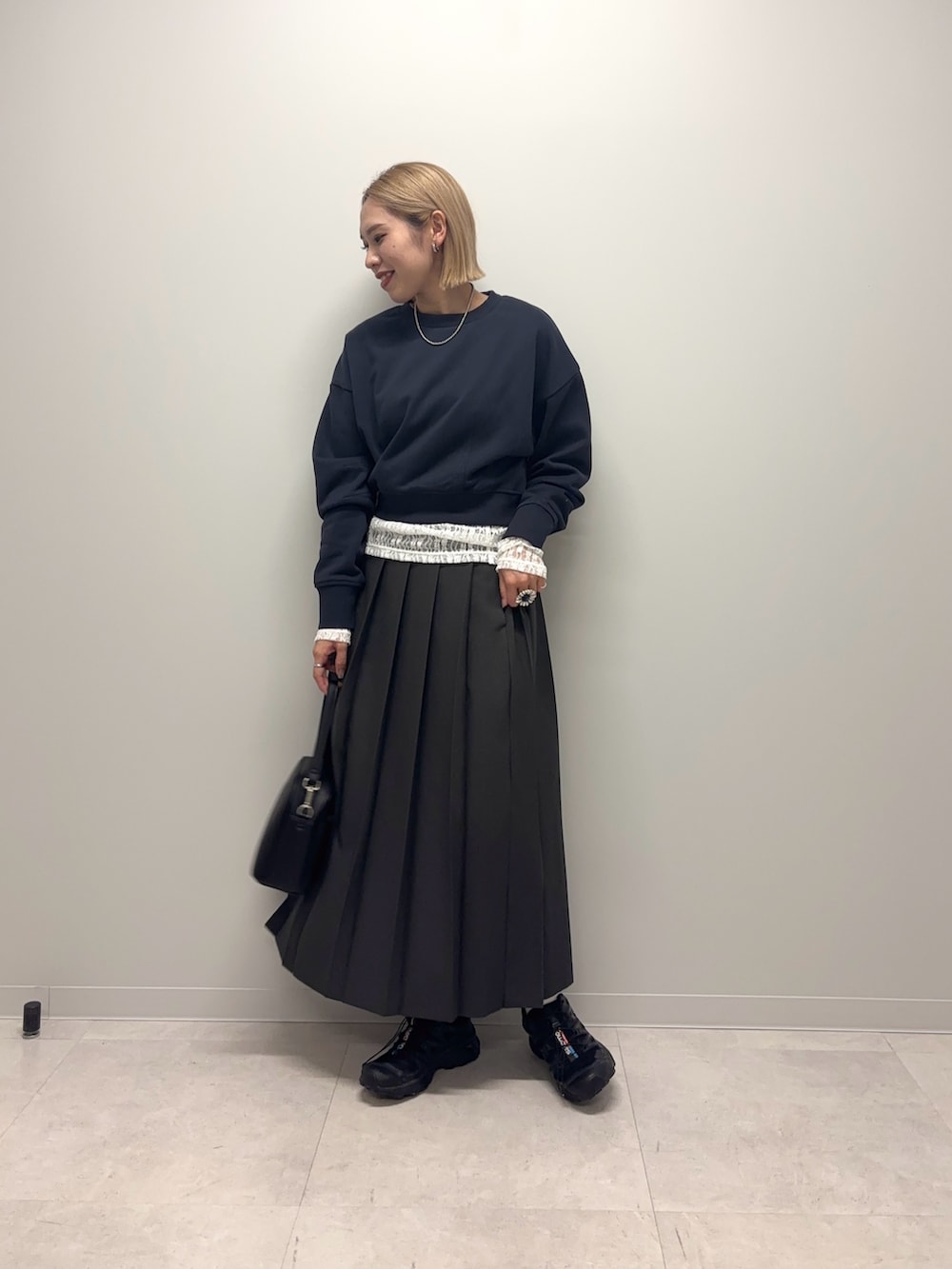 短い分レイヤードも楽しめる丈感で私はレースをチラ見せさせてみました!シャツと重ねるのもオススメですし1枚で着ると脚長効果抜群です◎