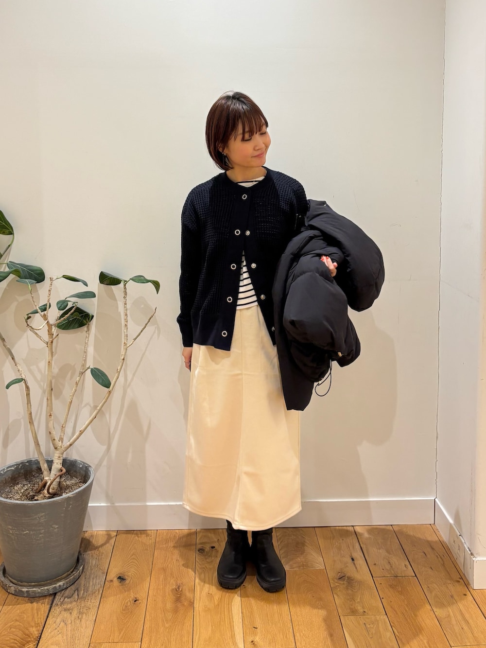 春にも使えるワッフルカーディガン着用しています!生地感が厚手すぎないので見た目よりも着膨れせずに着ていただくことができますよ◎