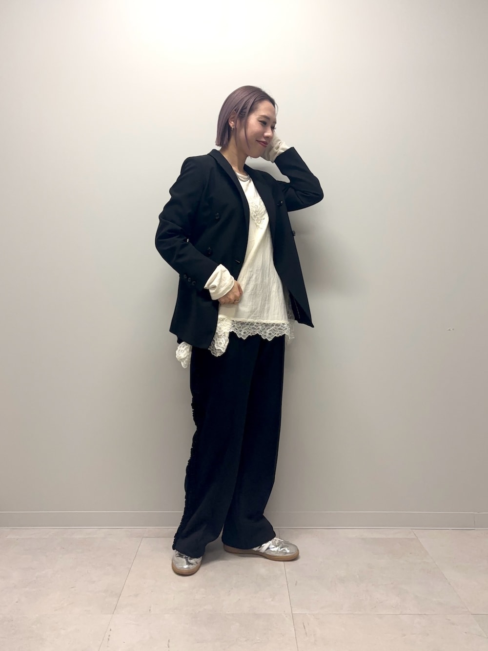 ジャケットは昨年購入してからヘビロテしています!季節の変わり目にも大活躍です!肩を落としていないので形がとにかくキレイでSサイズでかなりジャストです!161cmで袖丈は手を伸ばすと少し短めですがインナーのロンTを覗かせたり、お袖は中がストライプなので捲し上げるのもオススメです♪