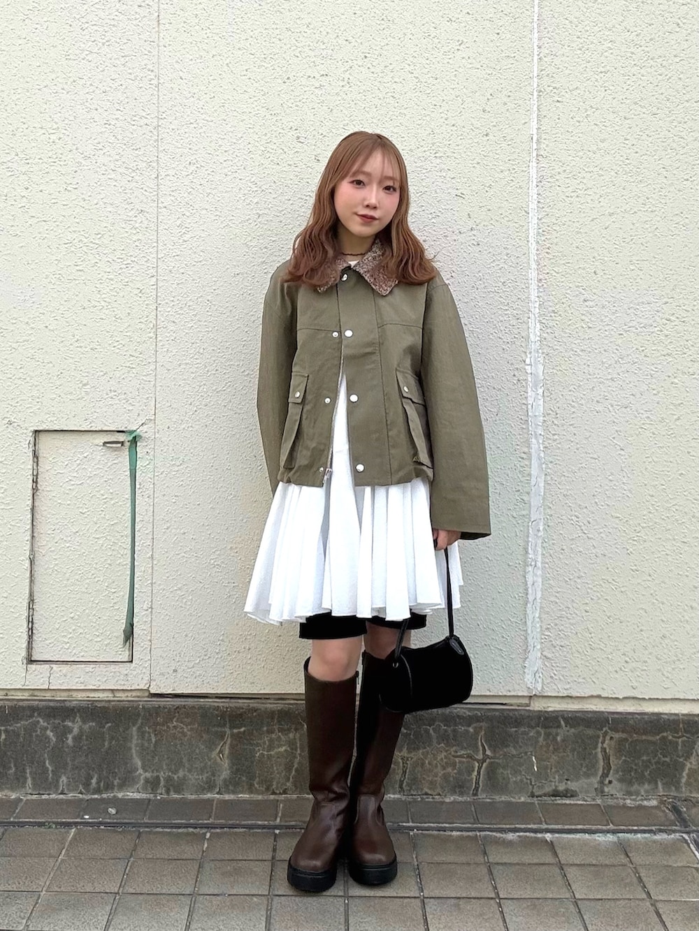 ミリタリーテイストな雰囲気が出るカーキに、甘めなミニワンピースで合わせてカジュアルダウンしてみました🌿