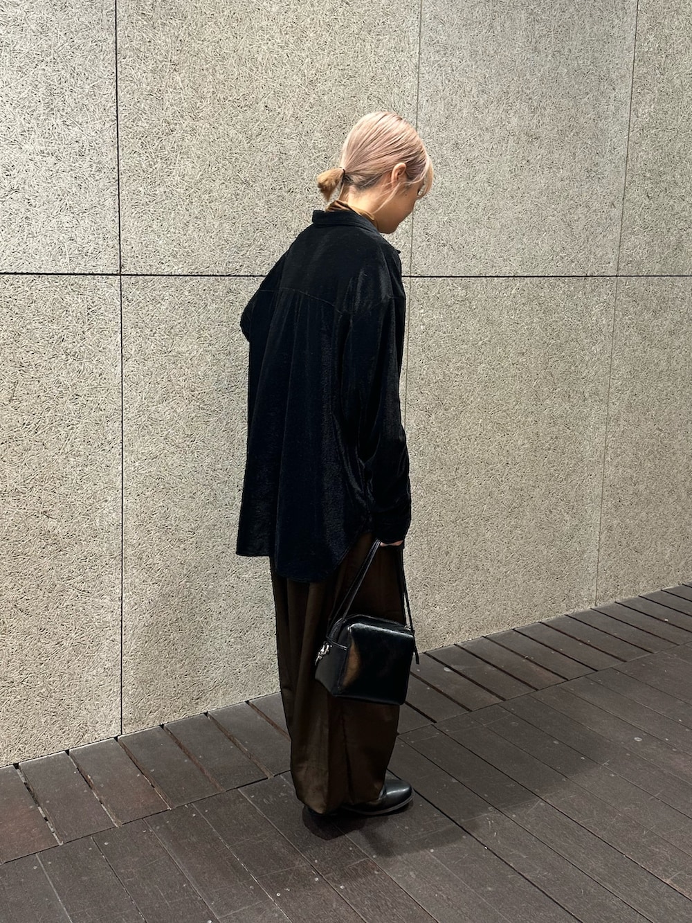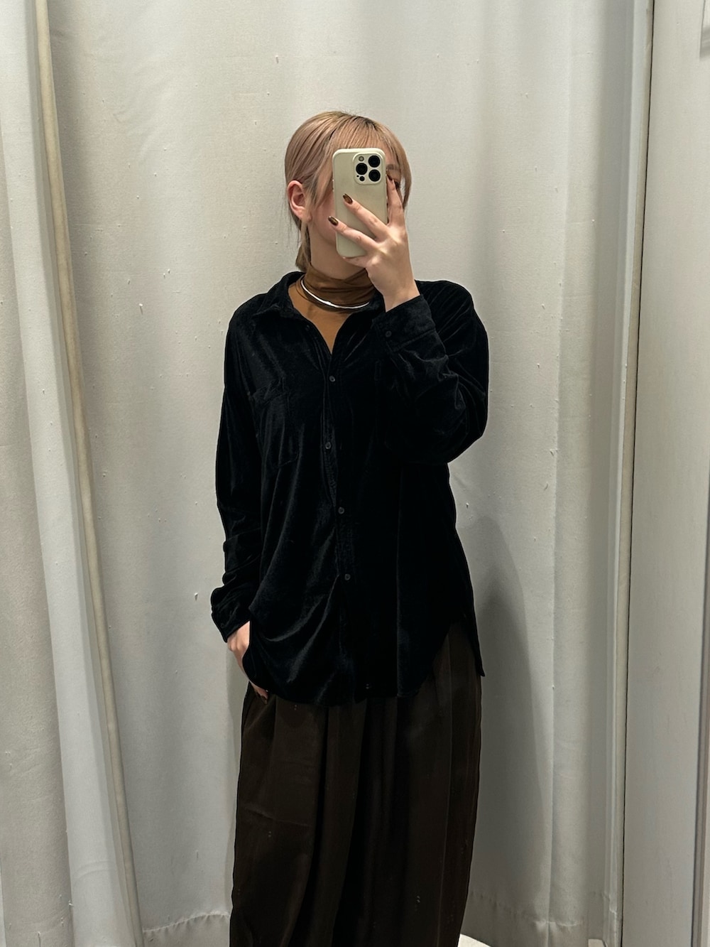 ベロアのシャツは光沢感があることで細見え効果!