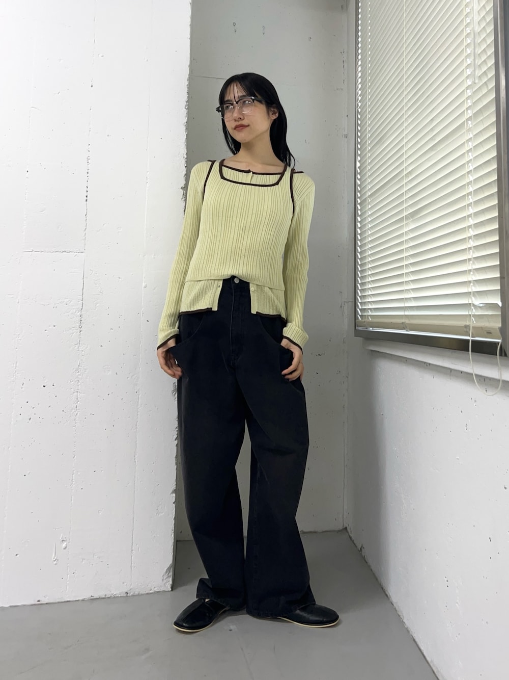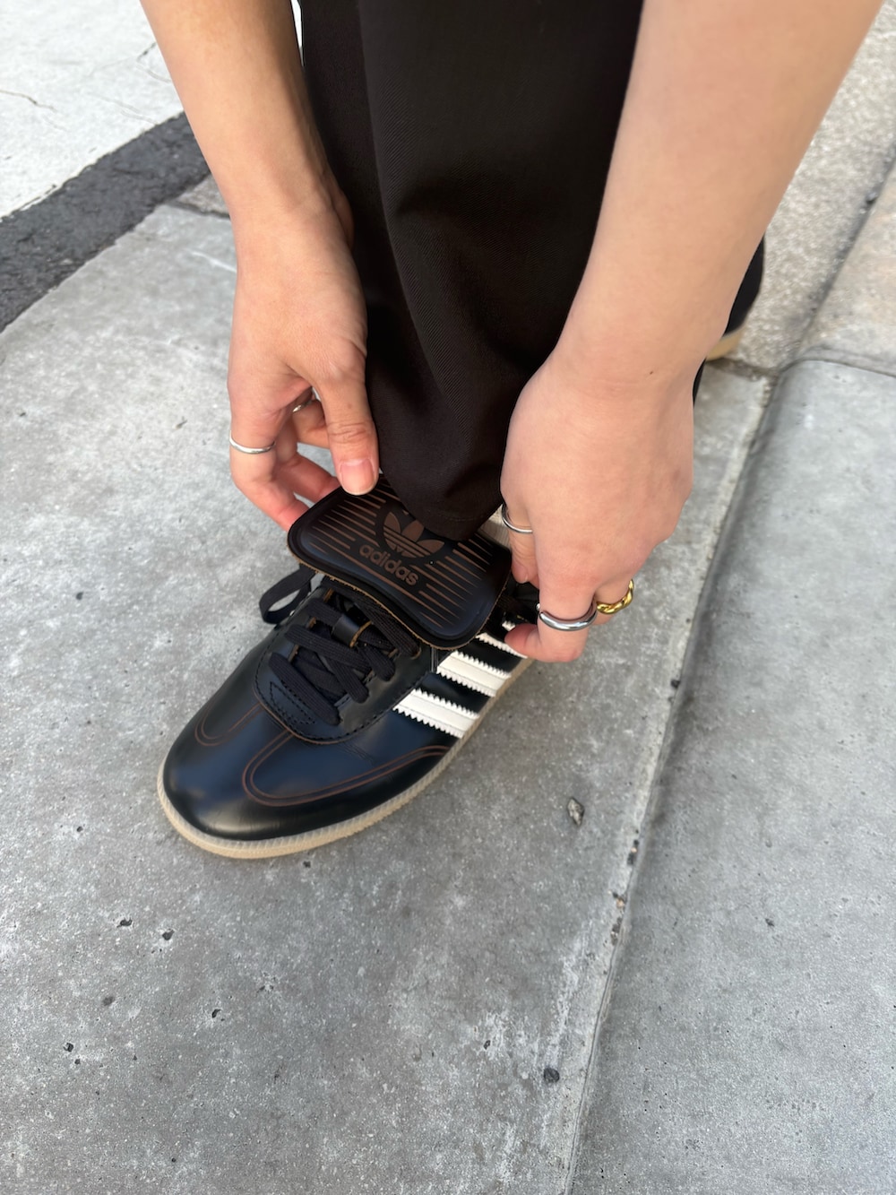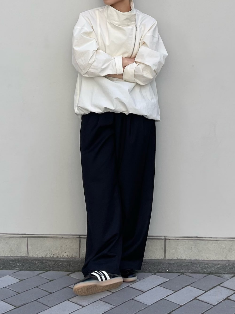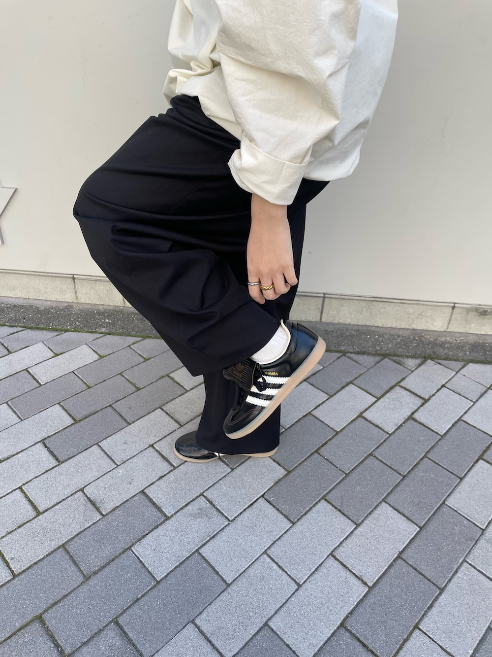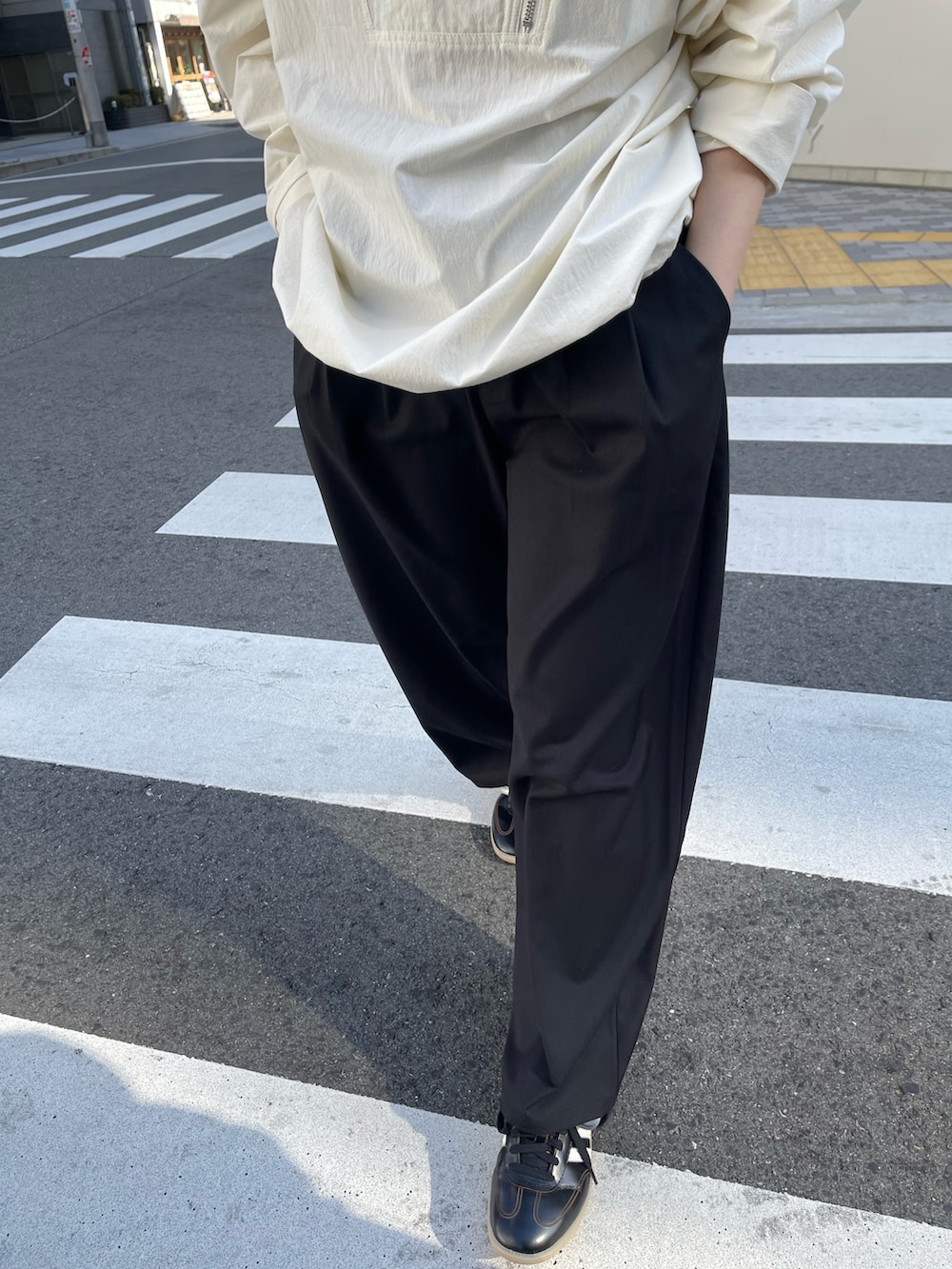 シックなブラックのスニーカーがカジュアルになりすぎずどこかモードさも感じるコーデに仕上げてくれます。