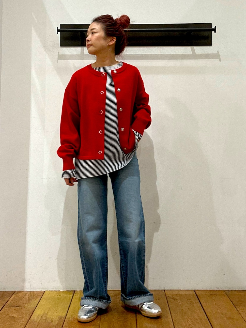 ビビットな赤のカーディガンはコーディネートを映させてくれるので私的押しカラーです◎