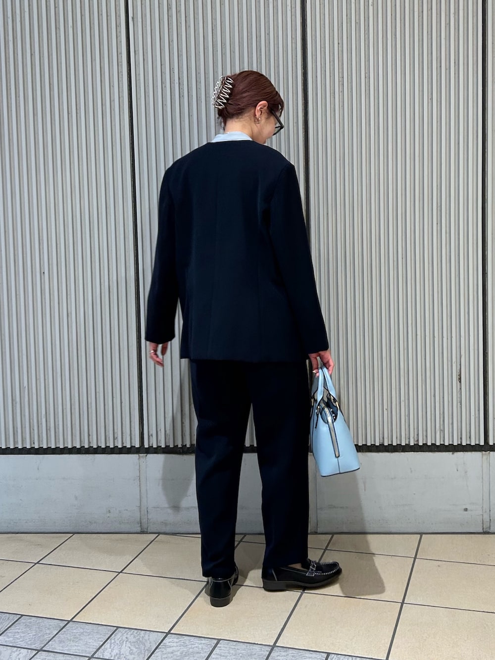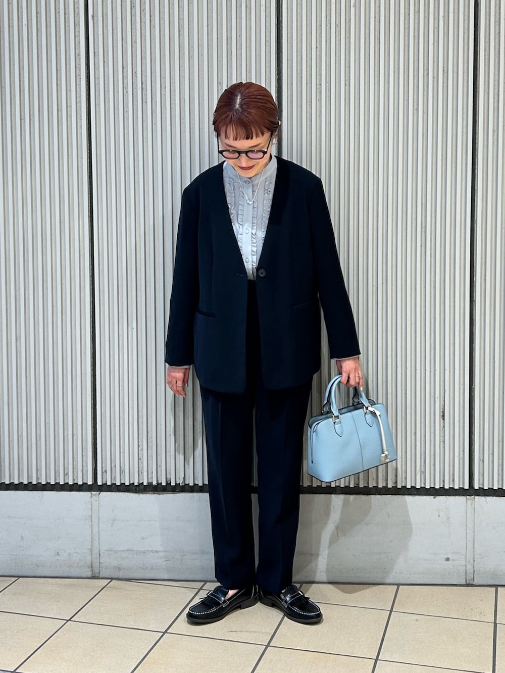 インナーのブラウスとバッグは春らしいブルーで合わせました。