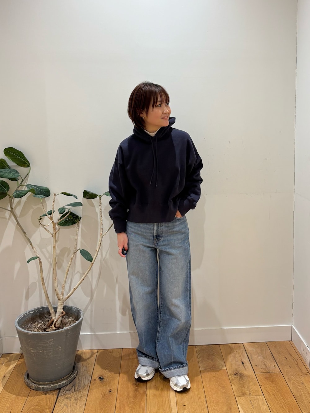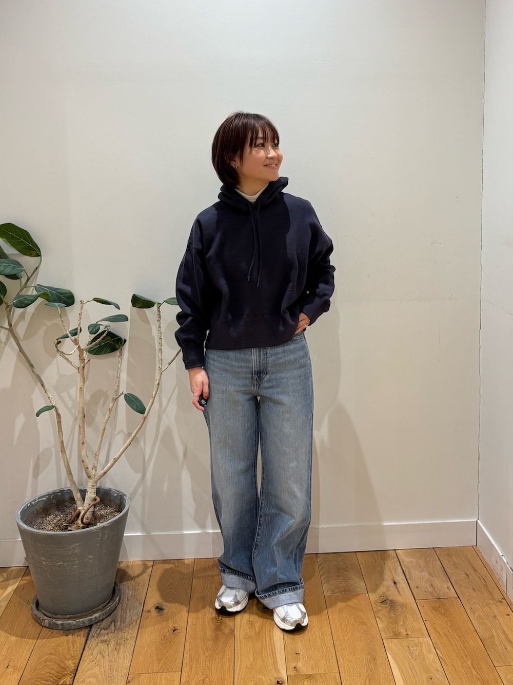ショート丈なので太めなパンツと合わせてスタイルアップをはかっています!
