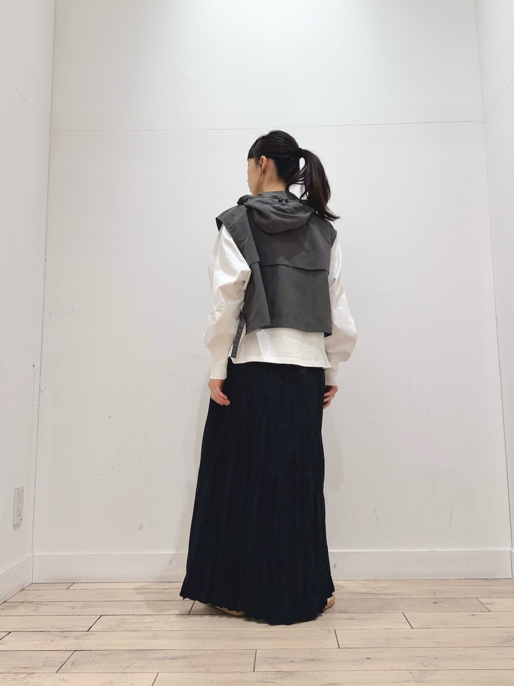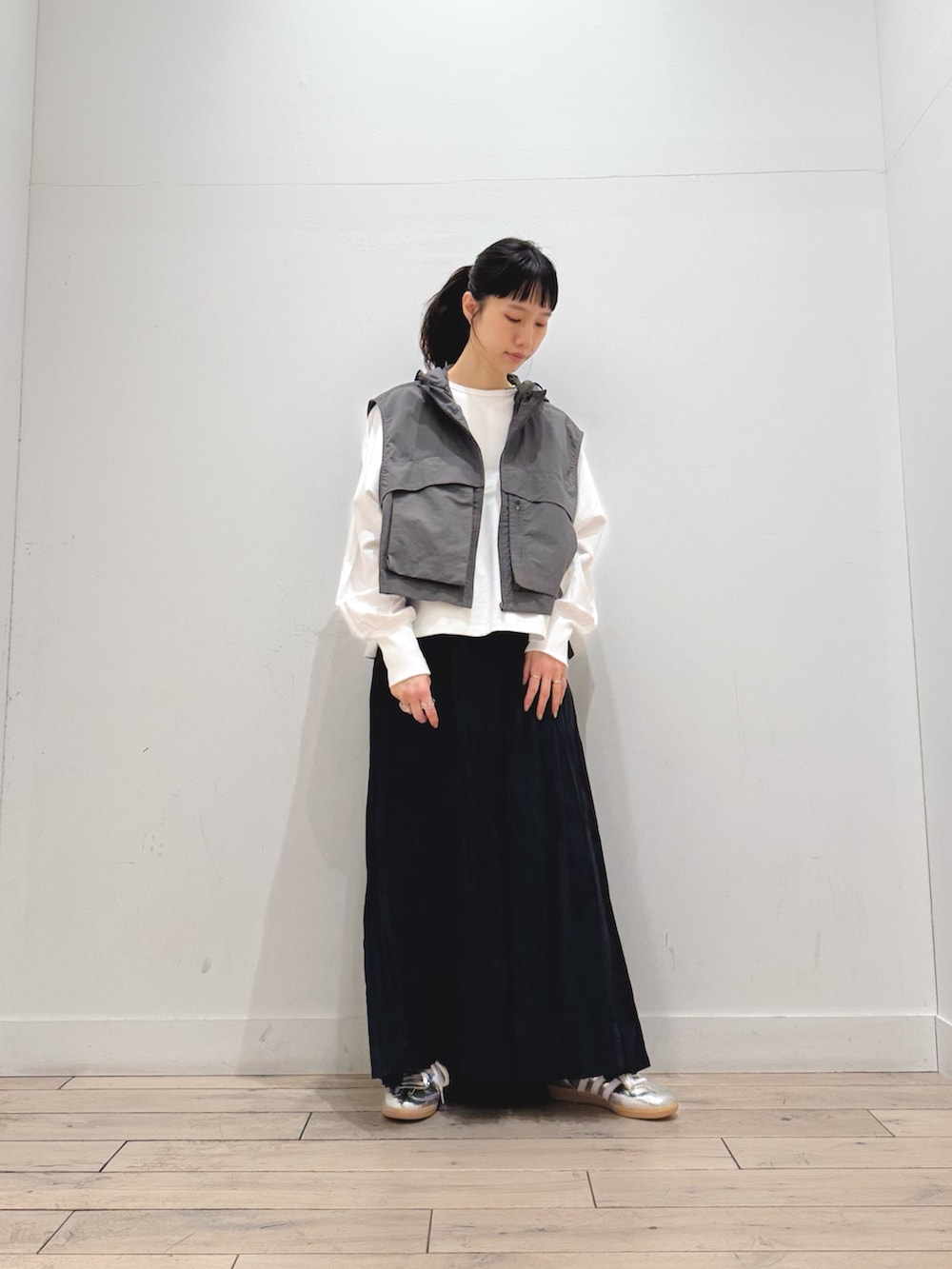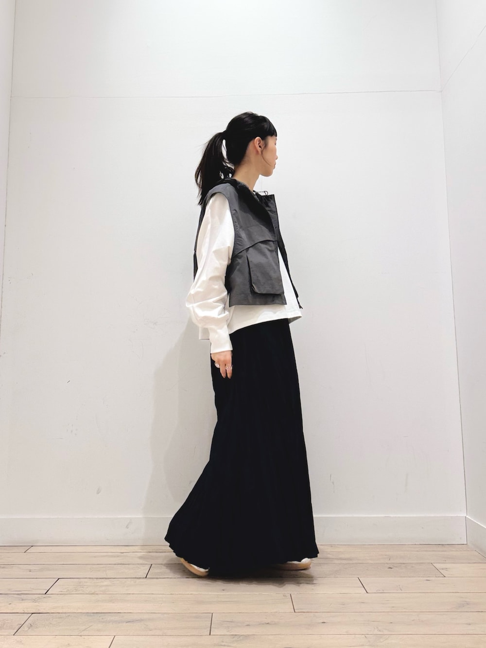 ベストは丈が短いので、ワイドパンツやスカートに幅広く合わせられます☺️