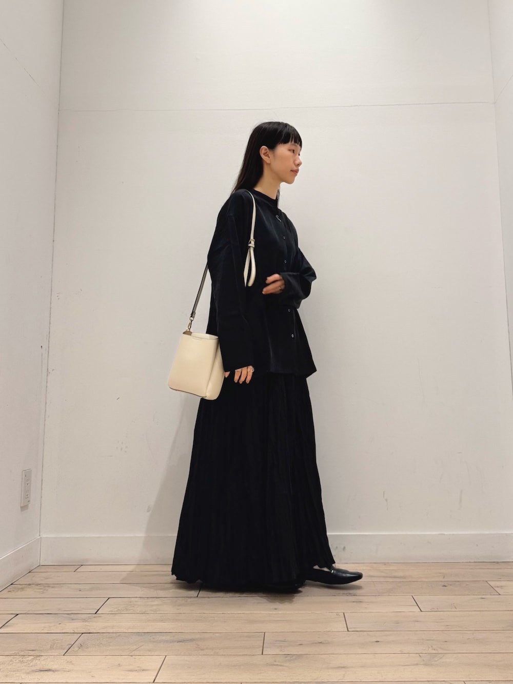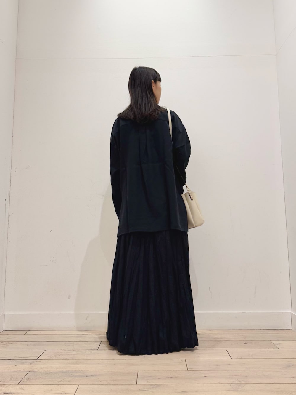 スカートにゆったりシャツを出したまま合わせたので、小さめのショルダーバッグを肩にかけてすっきり見えするようにしました◎