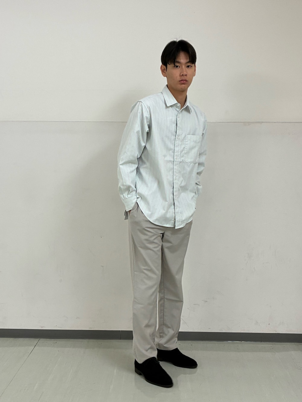 ボトムにはウールライクトラウザーを合わせることで、カジュアルなシャツスタイルを程よく上品にアップデート。全体を淡いトーンでまとめつつ、足元の黒で引き締めるのが今の気分です。