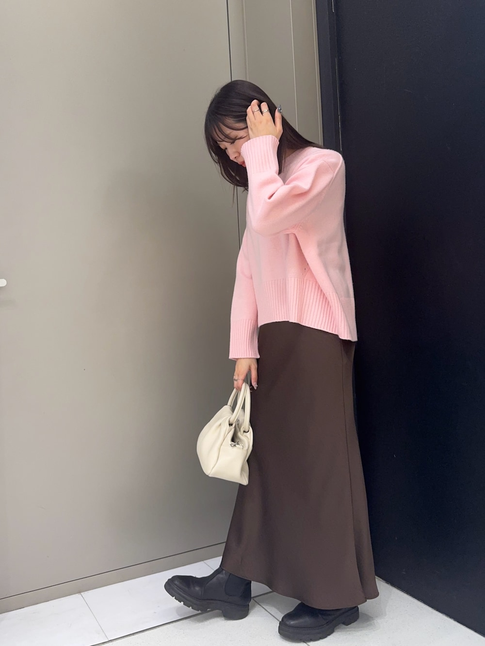 ニットがゆったりしている形なので甘くなりすぎずに着ることができますよ!